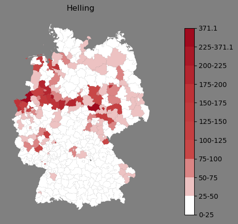 Relative Verteilung des Namens Helling (1996)Direkt zur Karte Die Farbskala zeigt die Anzahl von "Helling" bezogen auf je 1 Million Einträge. |