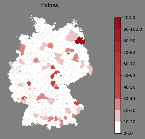 Relative Verteilung des Namens Helmut (1996)Direkt zur Karte Die Farbskala zeigt die Anzahl von "Helmut" bezogen auf je 1 Million Einträge. |