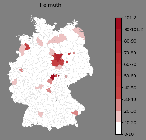 Relative Verteilung des Namens Helmuth (1996)Direkt zur Karte Die Farbskala zeigt die Anzahl von "Helmuth" bezogen auf je 1 Million Einträge. |