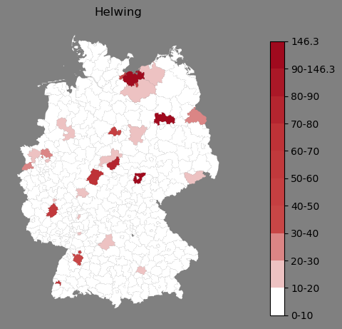 Relative Verteilung des Namens Helwing (1996)Direkt zur Karte Die Farbskala zeigt die Anzahl von "Helwing" bezogen auf je 1 Million Einträge. |