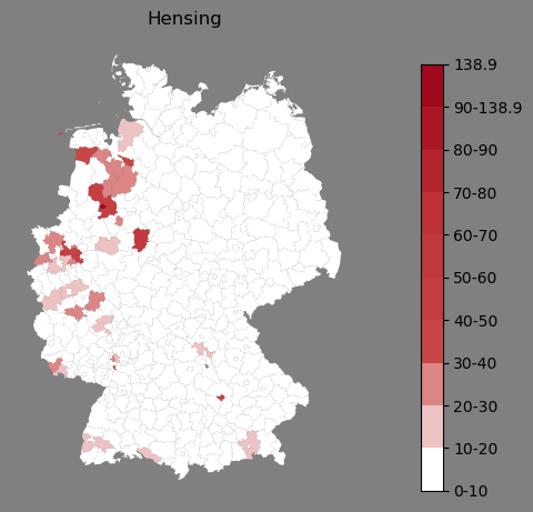 Relative Verteilung des Namens Hensing (1996)Direkt zur Karte Die Farbskala zeigt die Anzahl von "Hensing" bezogen auf je 1 Million Einträge. |