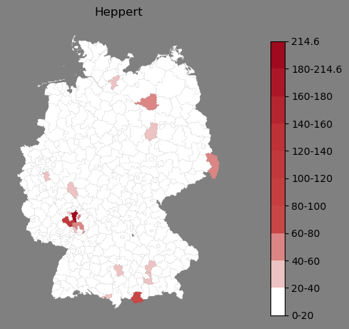 Relative Verteilung des Namens Heppert (1996)Direkt zur Karte Die Farbskala zeigt die Anzahl von "Heppert" bezogen auf je 1 Million Einträge. |