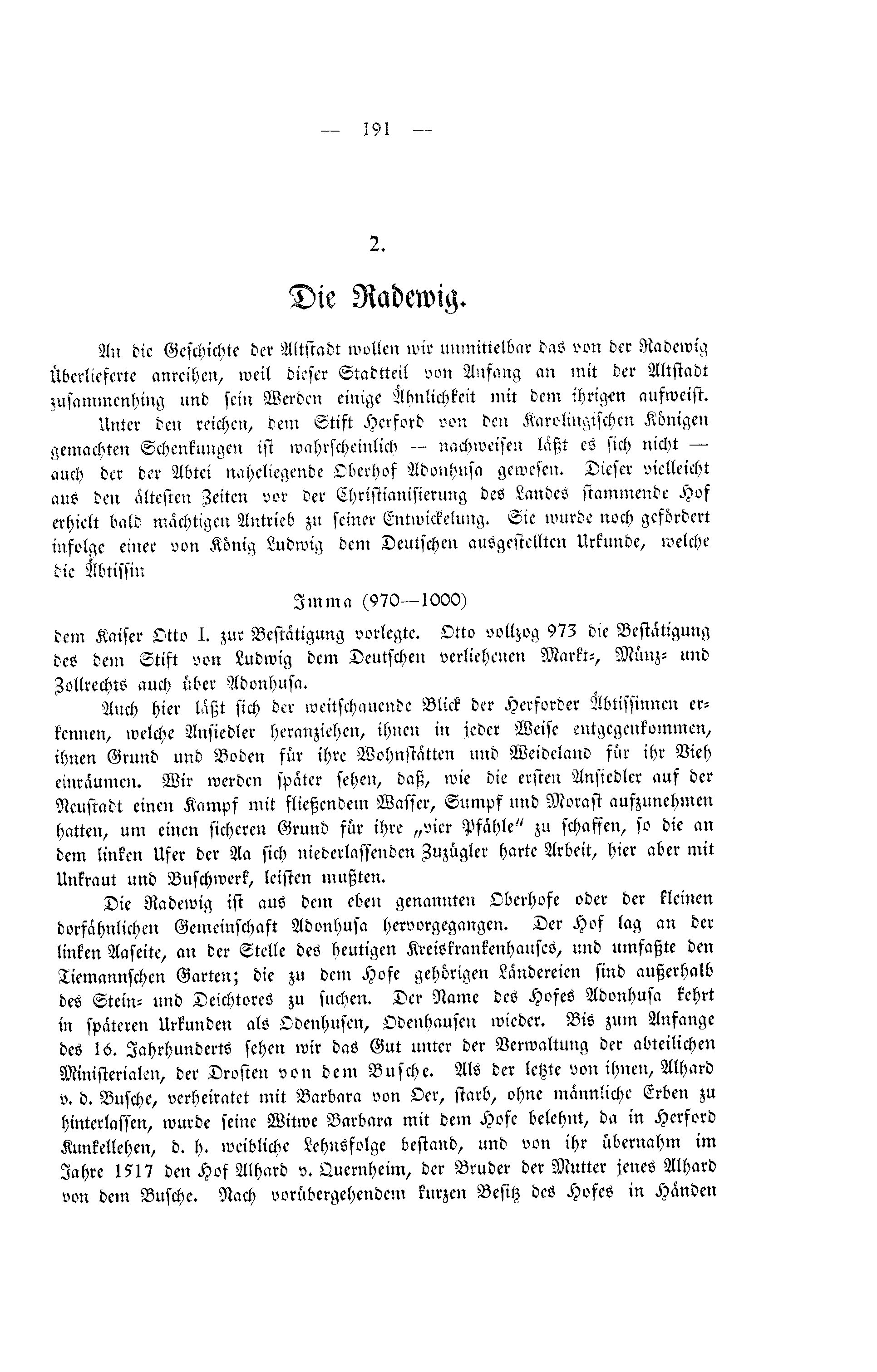 Die Radewig ist aus dem eben genannten Oberhofe oder der kleinen dorfähnlichen Gemeinschaft Adonhusa hervorgegangen. Der Hof lag an der linken Aaseite, an der Stelle des heutigen Kreiskrankenhauses, und umfaßte den Tiemannschen Garten; die zu dem Hofe gehörigen Ländereien sind außerhalb des Stein- und Deichtores zu suchen. Der Name des Hofes Adonhusa kehrt in späteren Urkunden als Odenhusen, Odenhausen wieder. Bis zum Anfange des 16. Jahrhunderts sehen wir das Gut unter der Verwaltung der abteilichen Ministerialen, der Drosten von dem Busche. Als der letzte von ihnen, Alhard v. d. Busche, verheiratet mit Barbara von Oer, starb, ohne männliche Erben zu hinterlassen, wurde seine Witwe Barbara mit dem Hofe belehnt, da in Herford Kunkellehen, d. h. weibliche Lehnsfolge bestand, und von ihr übernahm im Jahre 1517 den Hof Alhard v. Quernheim, der Bruder der Mutter jenes Alhard von dem Busche. Nach vorübergehendem kurzen Besitz des Hofes in Händen