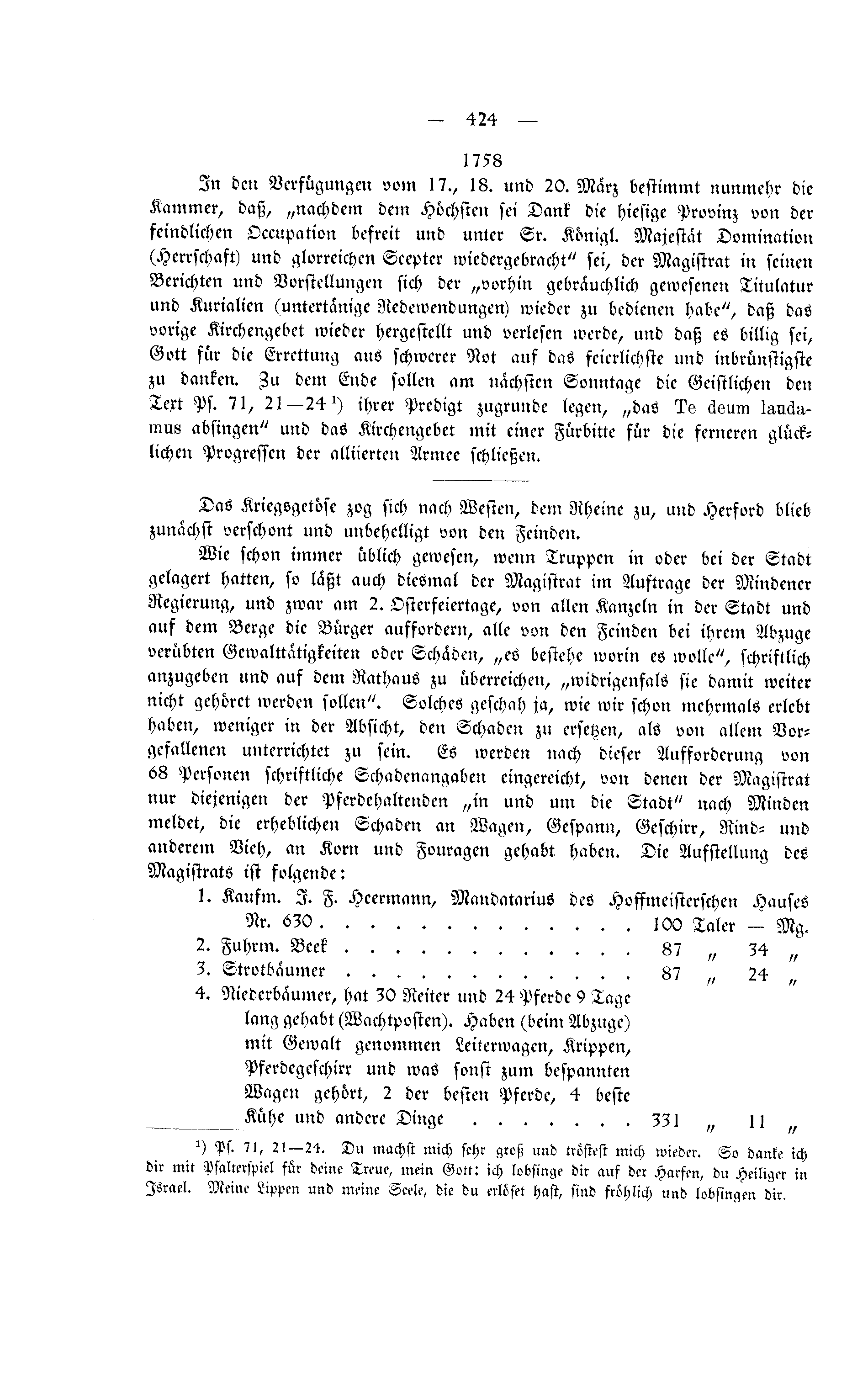 Wie schon immer üblich gewesen, wenn Truppen in oder bei der Stadt gelagert hatten, so läßt auch diesmal der Magistrat im Auftrage der Mindener Regierung, und zwar am 2. Osterfeiertage, von allen Kanzeln in der Stadt und auf dem Berge die Bürger auffordern, alle von den Feinden bei ihrem Abzüge verübten Gewalttätigkeiten oder Schäden, „es bestehe worin es wolle“, schriftlich anzugeben und auf dem Rathaus zu überreichen, „widrigenfals sie damit weiter nicht gehöret werden sollen“. Solches geschah ja, wie wir schon mehrmals erlebt haben, weniger in der Absicht, den Schaden zu ersetzen, als von allem Vorgefallenen unterrichtet zu sein. Es werden nach dieser Aufforderung von 68 Personen schriftliche Schadenangaben eingereicht, von denen der Magistrat nur diejenigen der Pferdehaltenden „in und um die Stadt“ nach Minden meldet, die erheblichen Schaden an Wagen, Gespann, Geschirr, Rind- und anderem Vieh, an Korn und Fouragen gehabt haben. Die Aufstellung des Magistrats ist folgende: