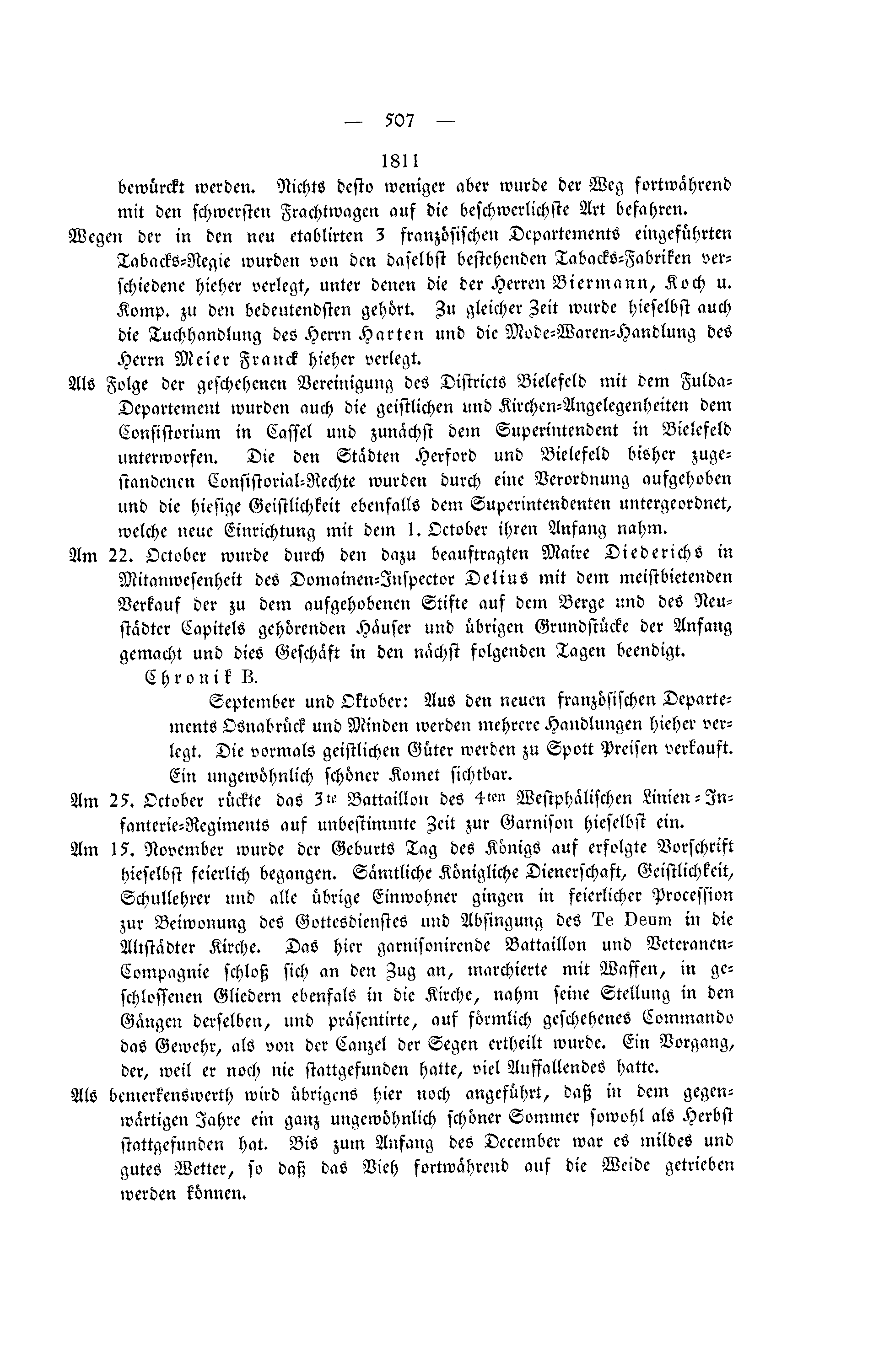 September und Oktober: Aus den neuen französischen Departements Osnabrück und Minden werden mehrere Handlungen hieher verlegt. Die vormals geistlichen Güter werden zu Spott Preisen verkauft. Ein ungewöhnlich schöner Komet sichtbar.