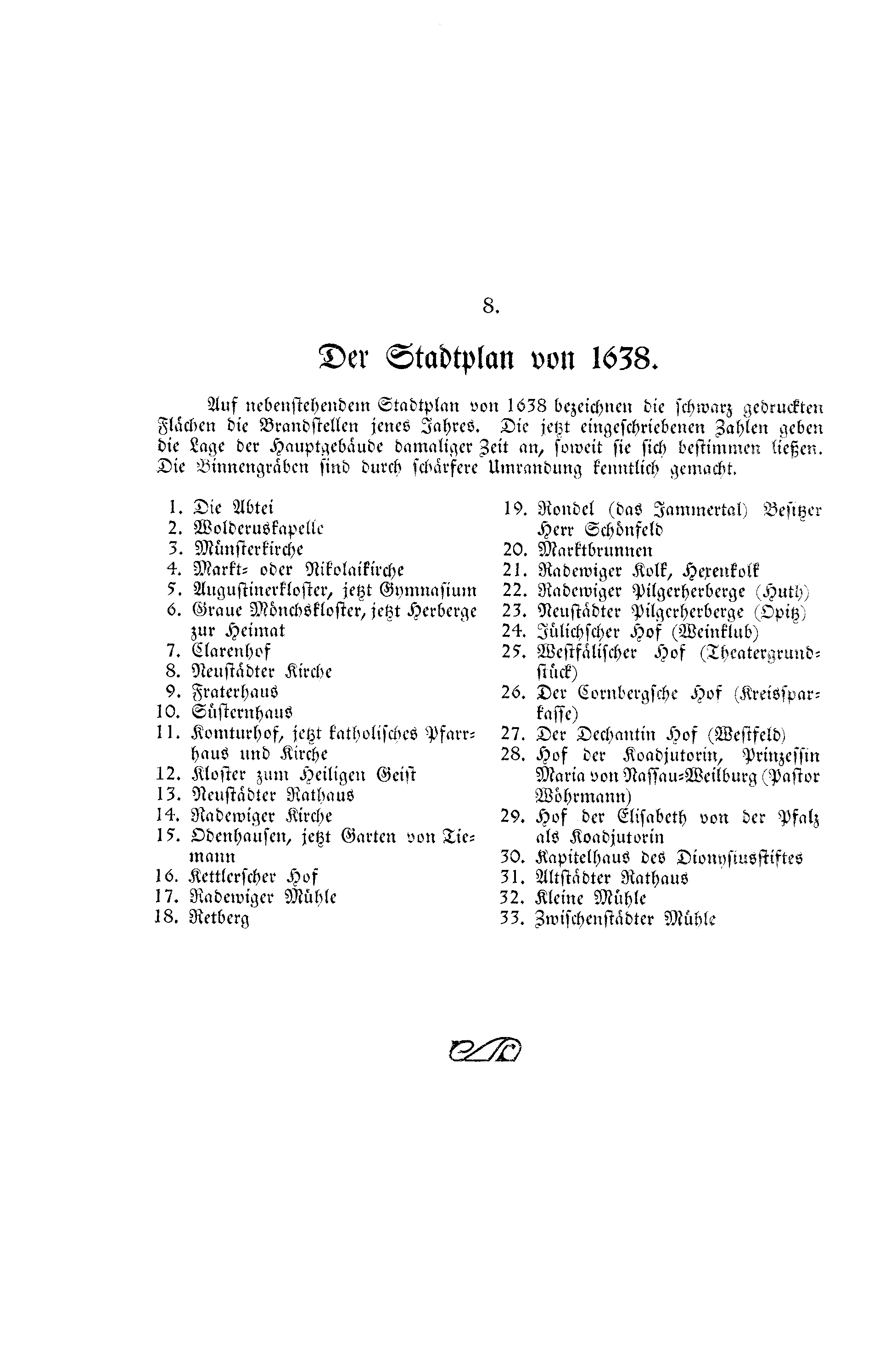 Auf nebenstehendem Stadtplan von 1638 bezeichnen die schwarz gedruckten Flächen die Brandstellen jenes Jahres. Die jetzt eingeschriebenen Zahlen geben die Lage der Hauptgebäude damaliger Zeit an, soweit sie sich bestimmen ließen. Die Binnengräben sind durch schärfere Umrandung kenntlich gemacht.