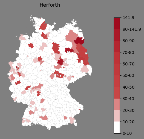 Relative Verteilung des Namens Herforth (1996)Direkt zur Karte Die Farbskala zeigt die Anzahl von "Herforth" bezogen auf je 1 Million Einträge. |