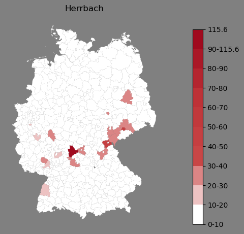 Absolute Verteilung des Namens Herrbach (1890)Direkt zur Karte Absolute Verteilung des Namens "Herrbach" um 1890 im damaligen Deutschen Reich Sie können die Karte innerhalb des Fensters zoomen und verschieben. |