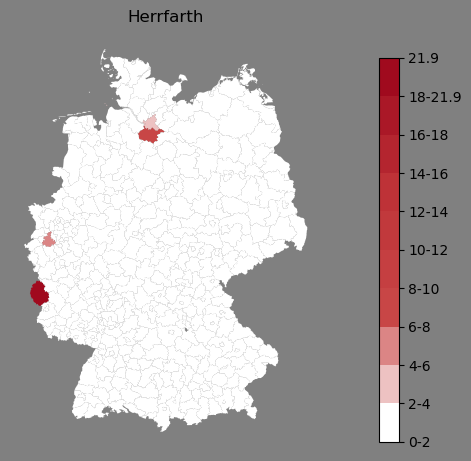 Relative Verteilung des Namens Herrfarth (1996)Direkt zur Karte Die Farbskala zeigt die Anzahl von "Herrfarth" bezogen auf je 1 Million Einträge. |