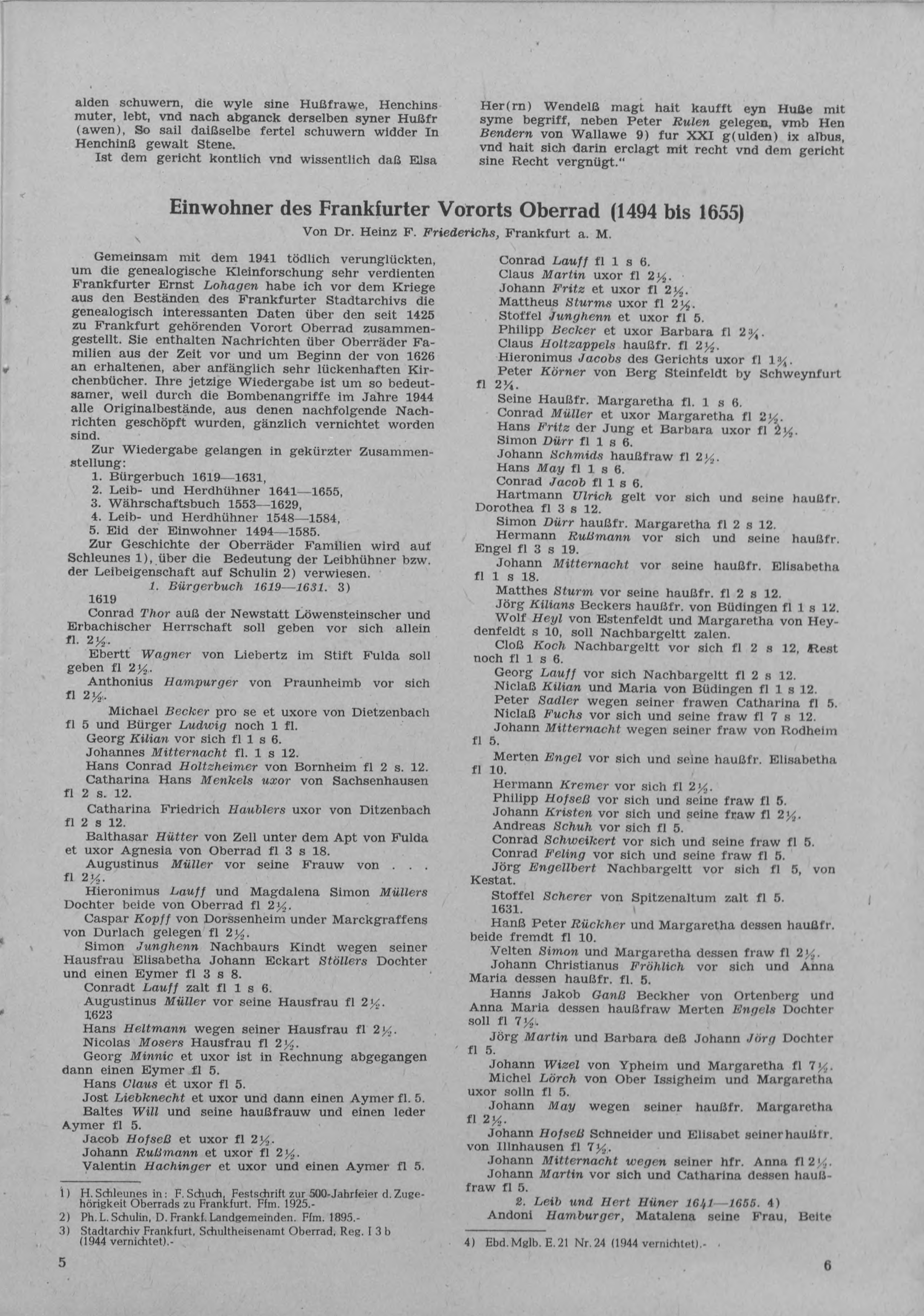 Gemeinsam mit dem 1941 tödlich verunglückten, um die genealogische Kleinforschung sehr verdienten Frankfurter Ernst Lohagen habe ich vor dem Kriege aus den Beständen des Frankfurter Stadtarchivs die genealogisch interessanten Daten über den seit 1425 zu Frankfurt gehörenden Vorort Oberrad zusammengestellt. Sie enthalten Nachrichten über Oberräder Familien aus der Zeit vor und um Beginn der von 1626 an erhaltenen, aber anfänglich sehr lückenhaften Kirchenbücher. Ihre jetzige Wiedergabe ist um so bedeutsamer, weil durch die Bombenangriffe im Jahre 1944 alle Originalbestände, aus denen nachfolgende Nachrichten geschöpft wurden, gänzlich vernichtet worden sind.