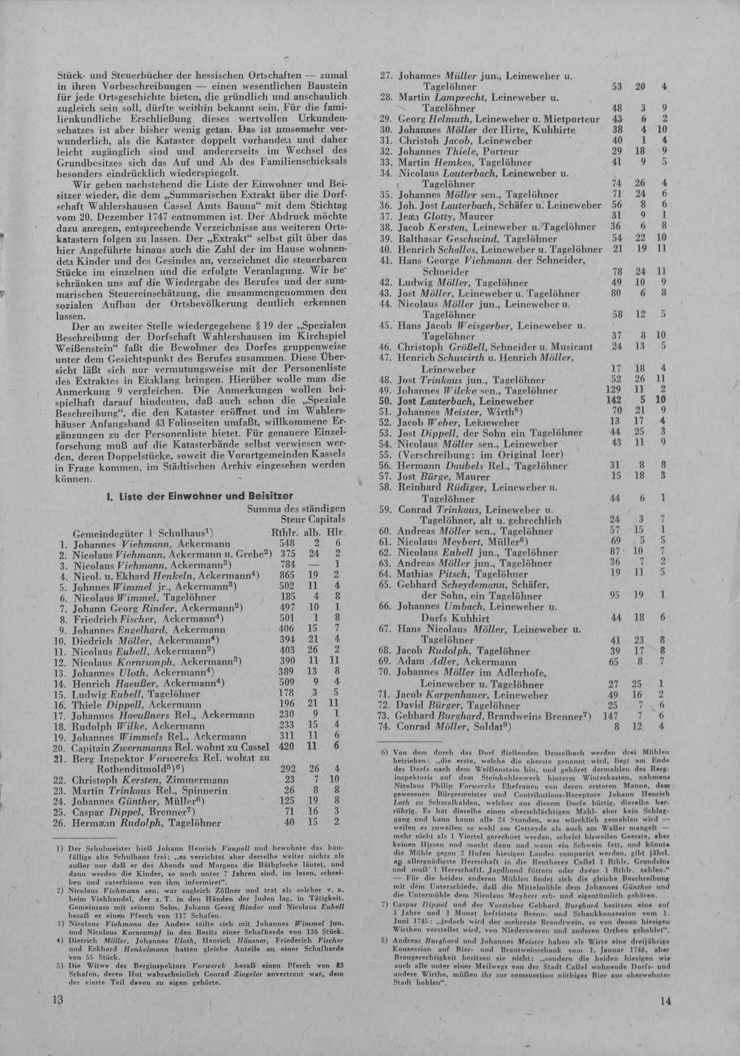 Der an zweiter Stelle wiedergegebene § 19 der „Spezialen Beschreibung der Dorfschaft Wahlershausen im Kirchspiel Weißenstein“ faßt die Bewohner des Dorfes gruppenweise unter dem Gesichtspunkt des Berufes zusammen. Diese Übersicht läßt sich nur vermutungsweise mit der Personenliste des Extraktes in Einklang bringen. Hierüber wolle man die Anmerkung 9 vergleichen. Die Anmerkungen wollen beispielhaft darauf hindeuten, daß auch schon die „Speziale Beschreibung“, die den Kataster eröffnet und im Wahlershäuser Anfangsband 43 Folioseiten umfaßt, willkommene Ergänzungen zu der Personenliste bietet. Für genauere Einzelforschung muß auf die Katasterbände selbst verwiesen werden, deren Doppelstücke, soweit die Vorortgemeinden Kassels in Frage kommen, im Städtischen Archiv eingesehen werden können.