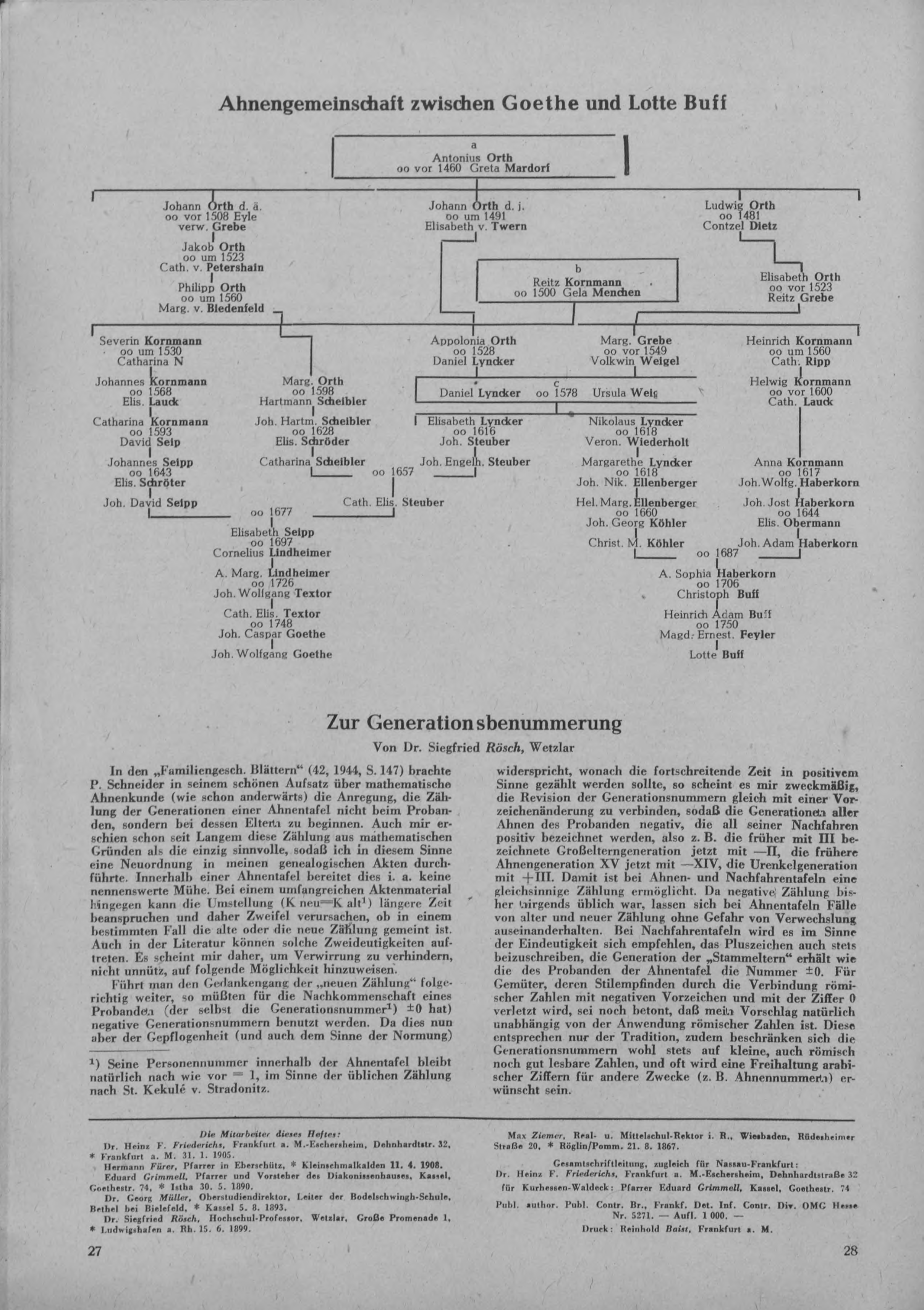 In den „Familiengesch. Blättern“ (42, 1944, S. 147) brachte P. Schneider in seinem schönen Aufsatz über mathematische Ahnenkunde (wie schon anderwärts) die Anregung, die Zählung der Generationen einer Ahnentafel nicht beim Probanden, sondern bei dessen Eltern zu beginnen. Auch mir erschien schon seit Langem diese Zählung aus mathematischen Gründen als die einzig sinnvolle, sodaß ich in diesem Sinne eine Neuordnung in meinen genealogischen Akten durchführte. Innerhalb einer Ahnentafel bereitet dies i. a. keine nennenswerte Mühe. Bei einem umfangreichen Aktenmaterial hingegen kann die Umstellung (K neu=K alt)[1] längere Zeit beanspruchen und daher Zweifel verursachen, ob in einem bestimmten Fall die alte oder die neue Zählung gemeint ist. Auch in der Literatur können solche Zweideutigkeiten auftreten. Es scheint mir daher, um Verwirrung zu verhindern, nicht unnütz, auf folgende Möglichkeit hinzuweisen.