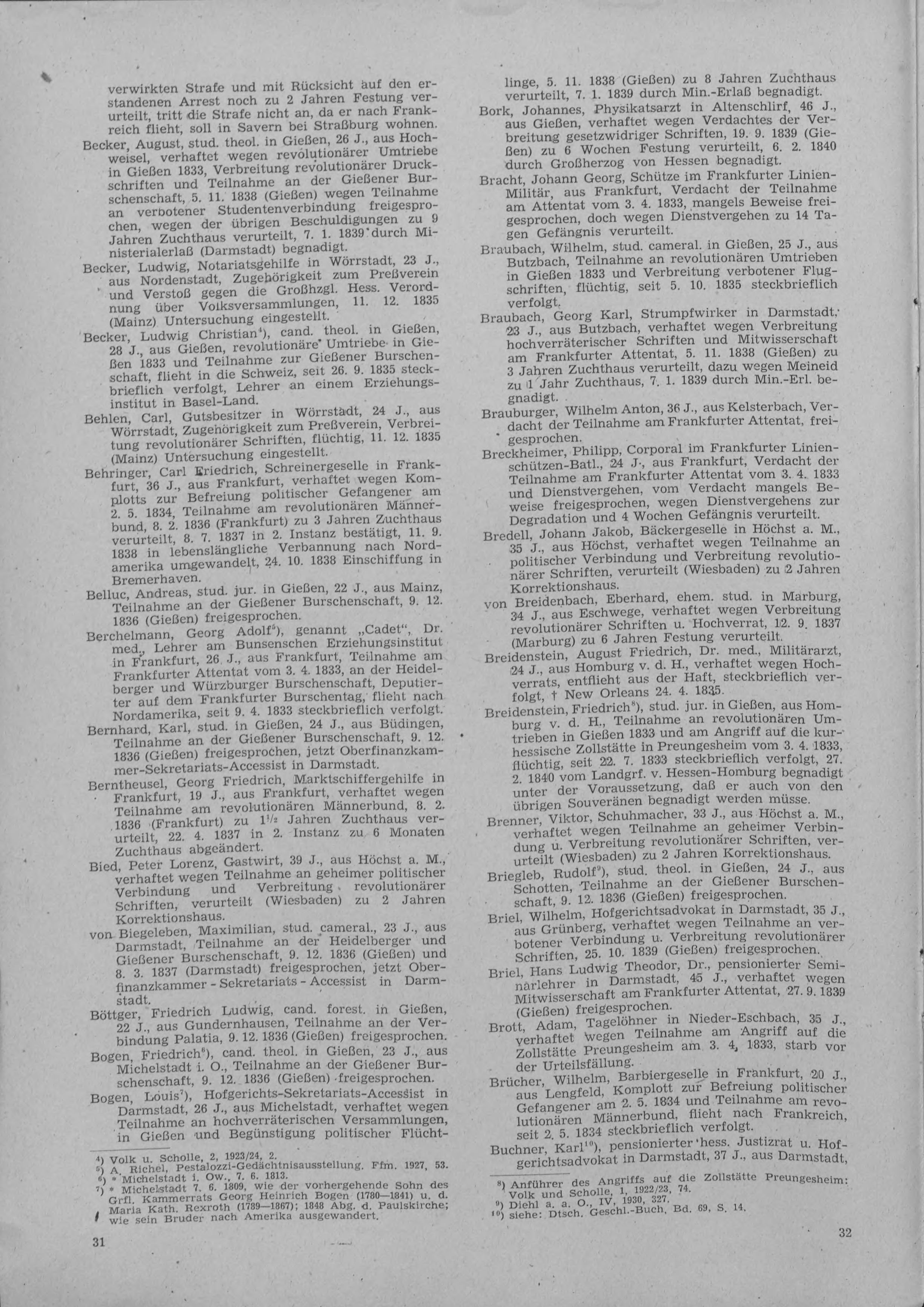 Braubach, Georg Karl, Strumpfwirker in Darmstadt, 23 J., aus Butzbach, verhaftet wegen Verbreitung hochverräterischer Schriften und Mitwisserschaft am Frankfurter Attentat, 5. 11. 1838 (Gießen) zu 3 Jahren Zuchthaus verurteilt, dazu wegen Meineid zu 1 Jahr Zuchthaus, 7. 1. 1839 durch Min.-Erl. begnadigt.