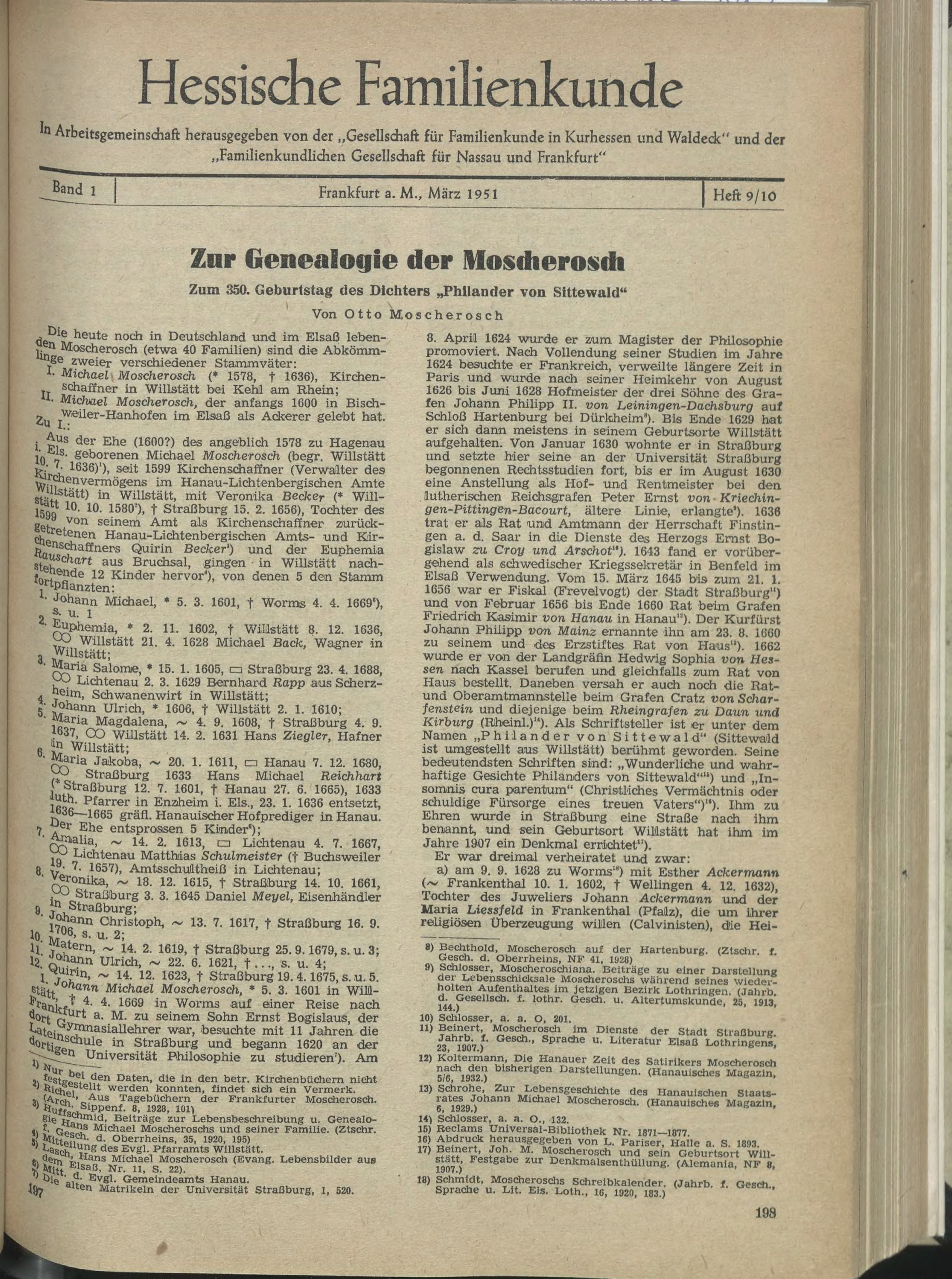 Hessische Familienkunde Bd. 1, Hefte 1-10, sowie 1 Registerheft, Arbeitsgemeinschaft der familienkundlichen Gesellschaften in Hessen (Hsg.), 1948-1951 Hier: Heft 9/10 (März 1951), enthaltend: Sp. 197-244.