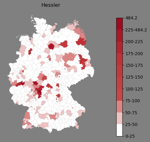 Absolute Verteilung des Namens Hessler (1890)Direkt zur Karte Absolute Verteilung des Namens "Hessler" um 1890 im damaligen Deutschen Reich Sie können die Karte innerhalb des Fensters zoomen und verschieben. |