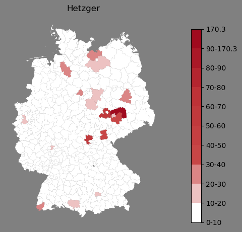 Relative Verteilung des Namens Hetzger (1996)Direkt zur Karte Die Farbskala zeigt die Anzahl von "Hetzger" bezogen auf je 1 Million Einträge. |