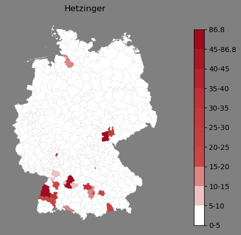 Absolute Verteilung des Namens Hetzinger (1890)Direkt zur Karte Absolute Verteilung des Namens "Hetzinger" um 1890 im damaligen Deutschen Reich Sie können die Karte innerhalb des Fensters zoomen und verschieben. |
