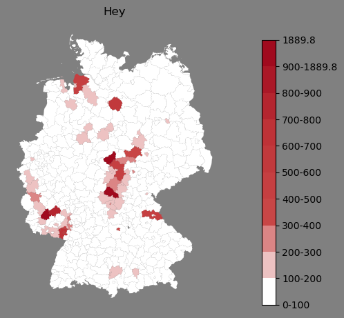Relative Verteilung des Namens Hey (1996)Direkt zur Karte Die Farbskala zeigt die Anzahl von "Hey" bezogen auf je 1 Million Einträge. |