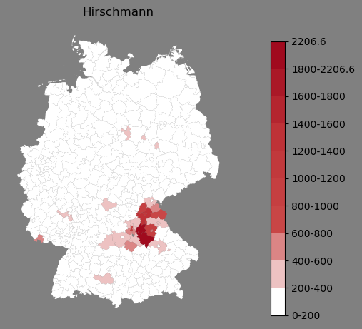 Relative Verteilung des Namens Hirschmann (1996)Direkt zur Karte Die Farbskala zeigt die Anzahl von "Hirschmann" bezogen auf je 1 Million Einträge. |
