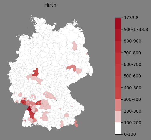Absolute Verteilung des Namens Hirth (1890)Direkt zur Karte Absolute Verteilung des Namens "Hirth" um 1890 im damaligen Deutschen Reich Sie können die Karte innerhalb des Fensters zoomen und verschieben. |