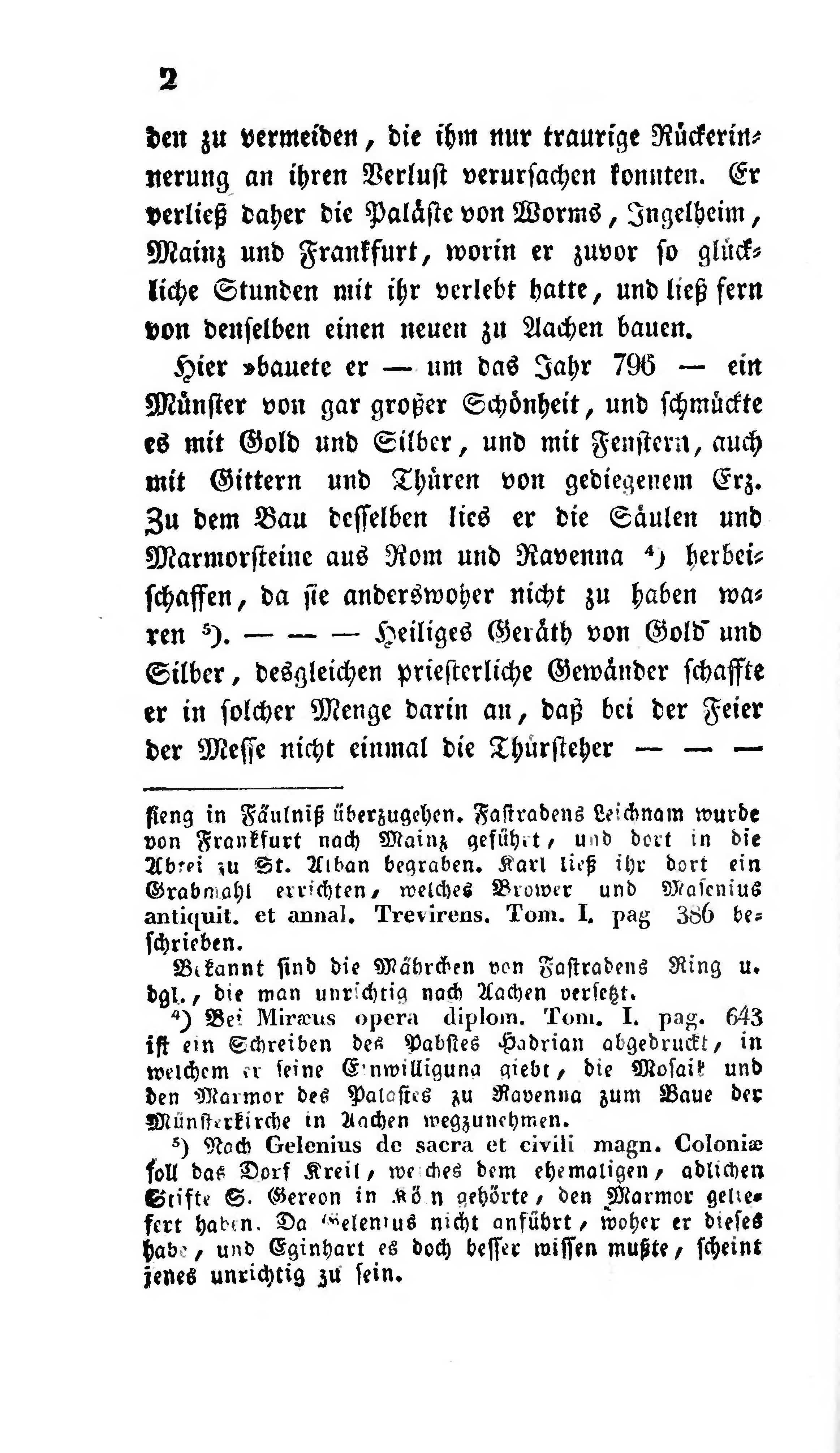 zu vermeiden, die ihm nur traurige Rückerinnerung an ihren Verlust verursachen konnten. Er verließ daher die Paläste von Worms, Ingelheim, Mainz und Frankfurt, worin er zuvor so glückliche Stunden mit ihr verlebt hatte, und ließ fern von denselben einen neuen zu Aachen bauen.