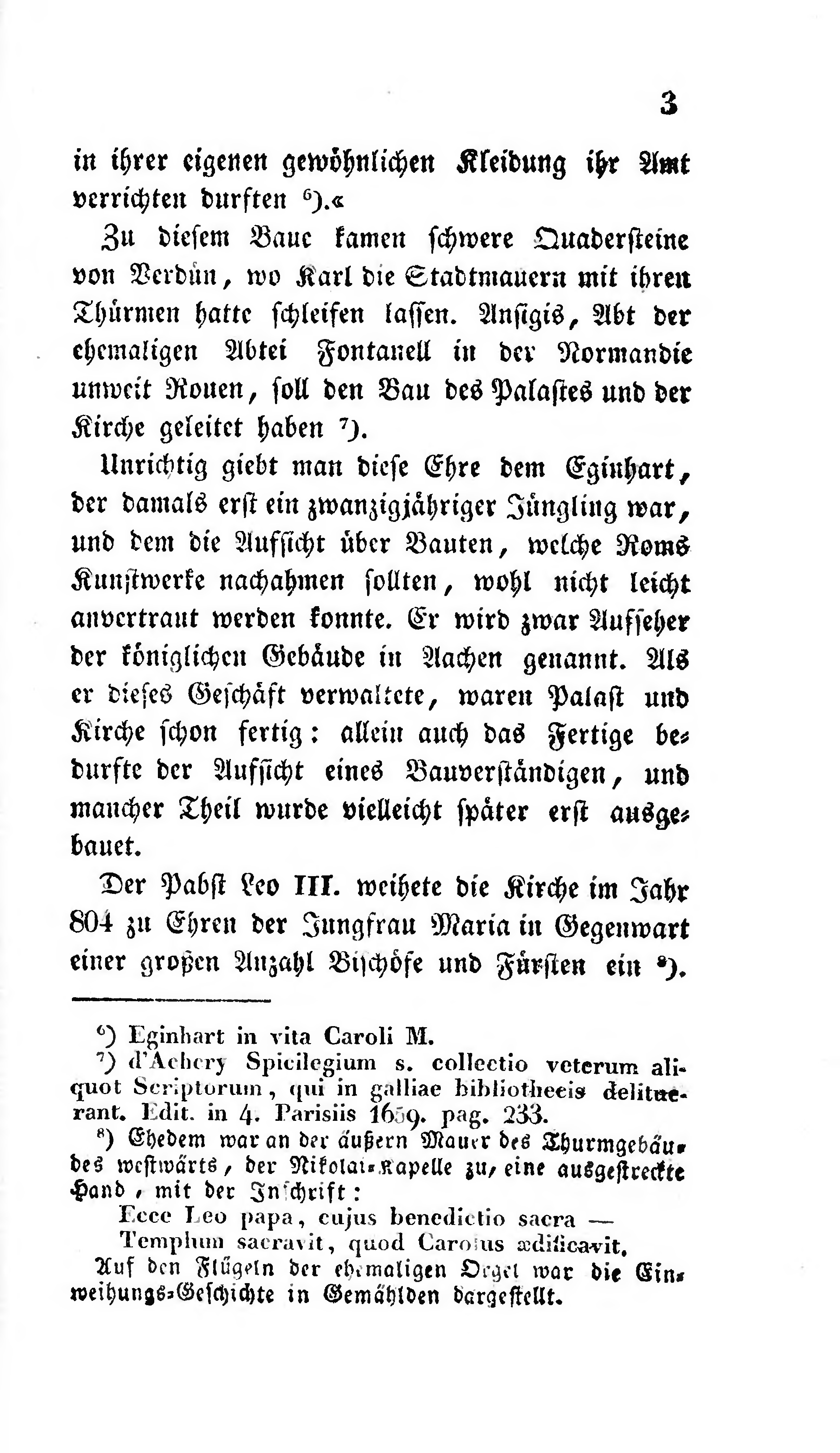 Zu diesem Baue kamen schwere Quadersteine von Verdun, wo Karl die Stadtmauern mit ihren Thürmen hatte schleifen lassen. Ansigis, Abt der ehemaligen Abtei Fontanell in der Normandie unweit Rouen, soll den Bau des Palastes und der Kirche geleitet haben [2]. Unrichtig giebt man diese Ehre dem Eginhart, der damals erst ein zwanzigjähriger Jüngling war, und dem die Aufsicht über Bauten, welche Roms Kunstwerke nachahmen sollten, wohl nicht leicht anvertrant werden konnte. Er wird zwar Aufseher der königlichen Gebäude in Aachen genannt. Als er dieses Geschäft verwaltete, waren Palast und Kirche schon fertig: allein auch das Fertige bedürfte der Aufsicht eines Bauverständigen, und mancher Theil wurde vielleicht später erst ausgebauet.