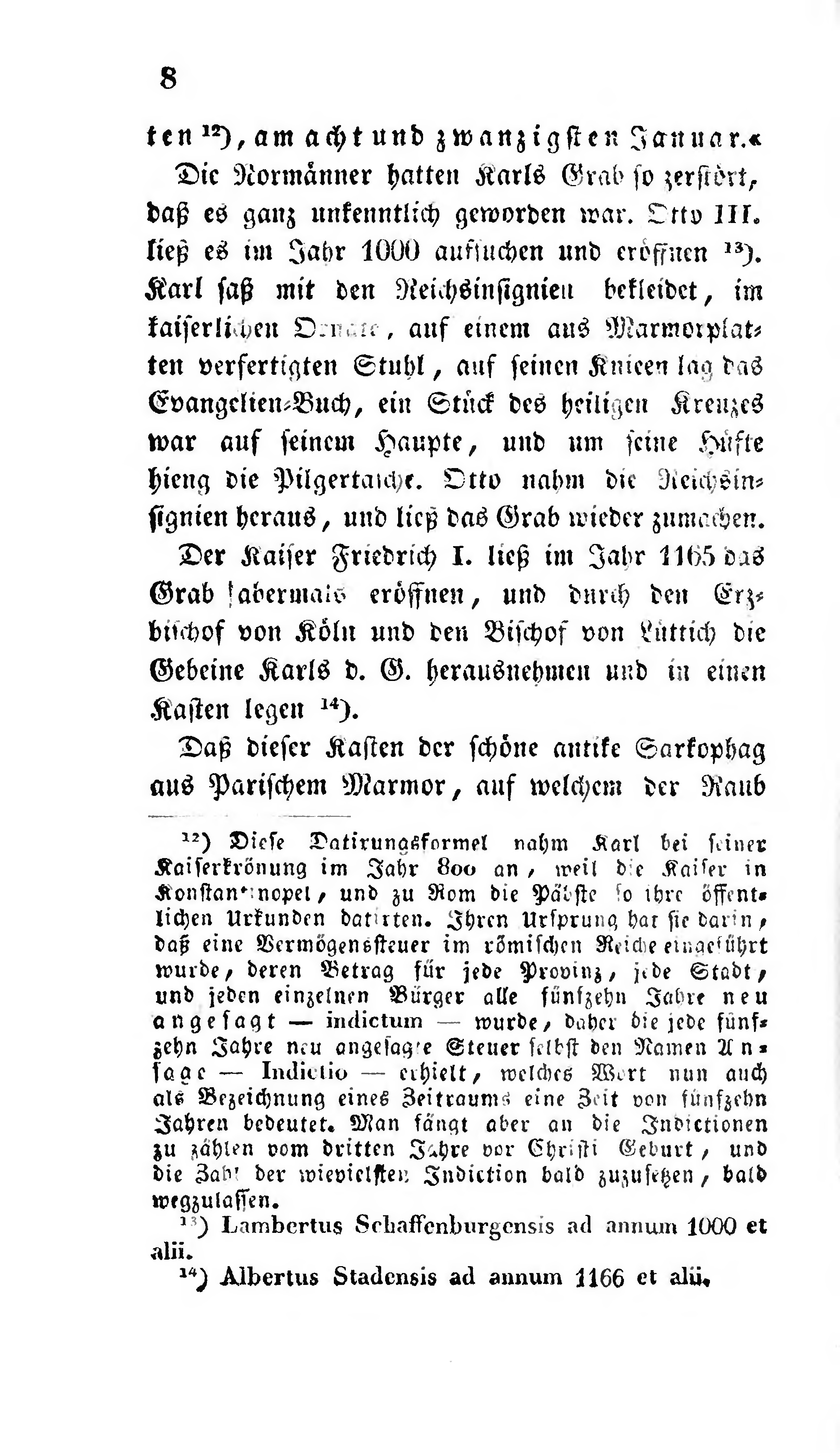 Die Normänner hatten Karls Grab so zerstört, daß es ganz unkenntlich geworden war. Otto III. ließ es im Jahr 1000 aufsuchen und eröffnen [1]. Karl saß mit den Reichsinsignien bekleidet, im kaiserlichen Ornate, auf einem aus Marmorplatten verfertigten Stuhl, auf seinen Knieen lag das Evangelien-Buch, ein Stück des heiligen Kreuzes war auf seinem Haupte, und um seine Hüfte hieng die Pilgertasche. Otto nahm die Reichsinsignien heraus, und ließ das Grab wieder zumachen.