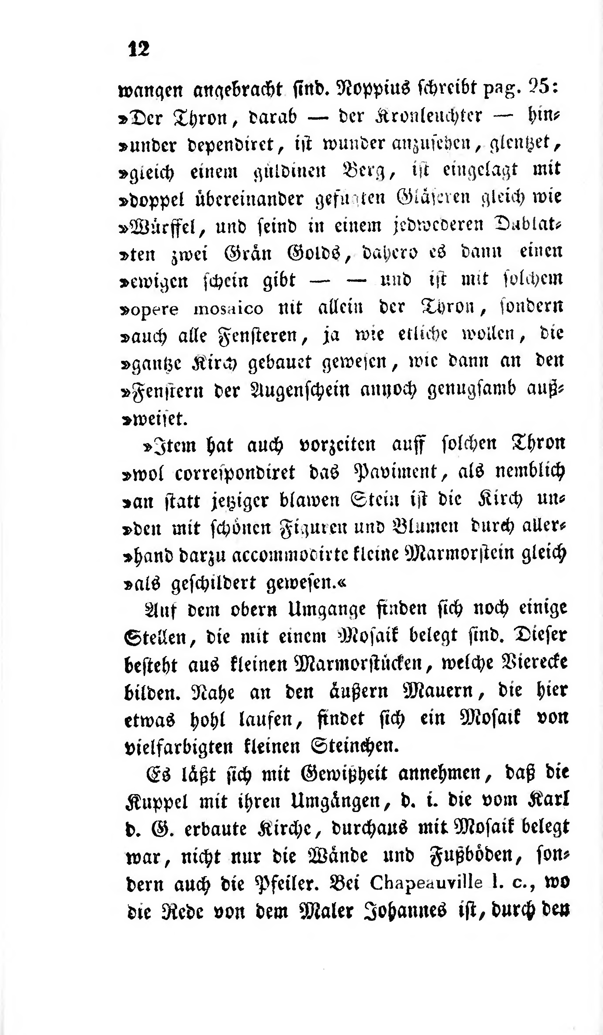 Es läßt sich mit Gewißheit annehmen, daß die Kuppel mit ihren Umgängen, d. i. die vom Karl d. G. erbaute Kirche, durchaus mit Mosaik belegt war, nicht nur die Wände und Fußböden, sondern auch die Pfeiler. Bei Chapeauville l. c., wo die Rede von dem Maler Johannes ist, durch den