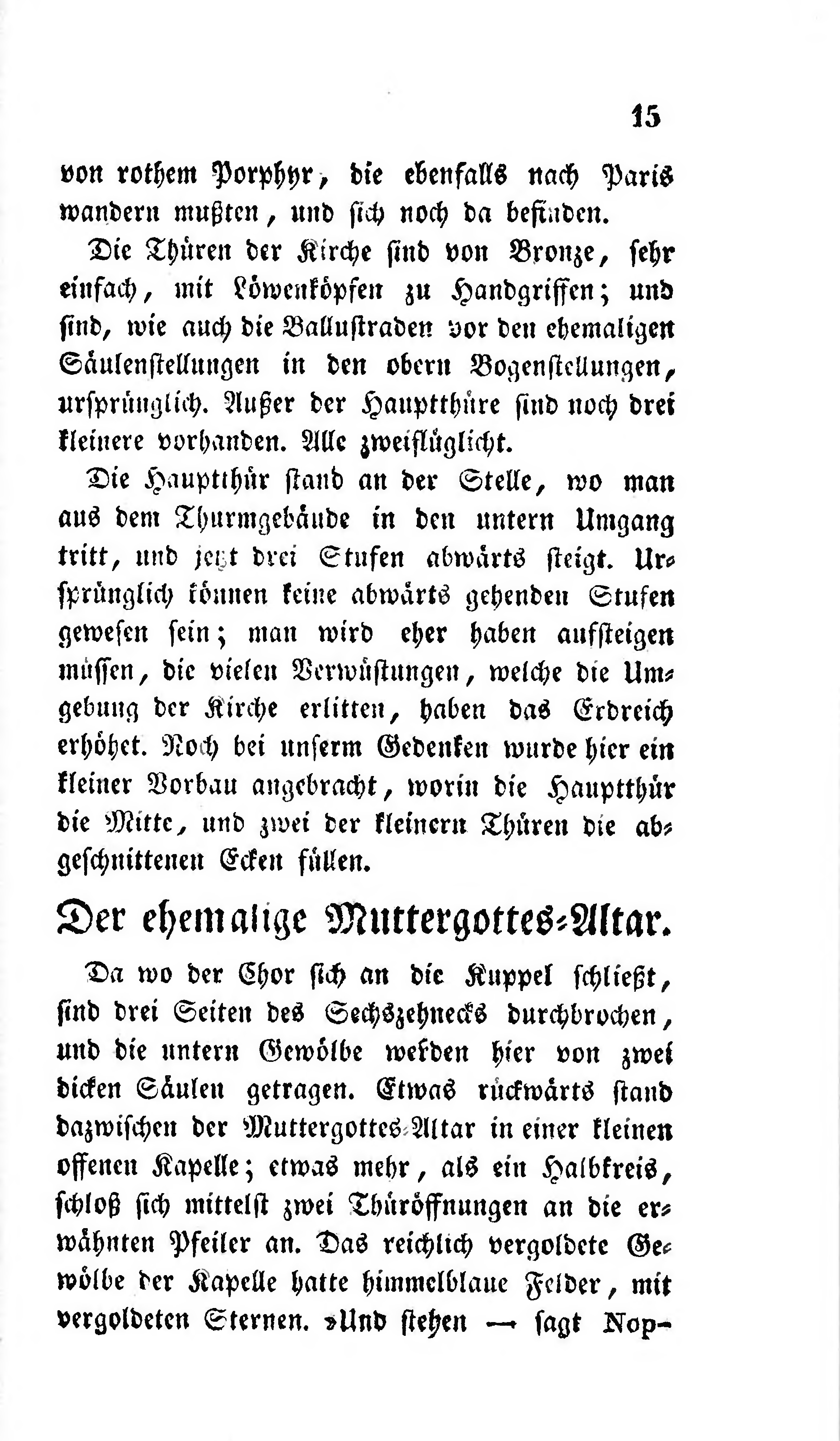 Da wo der Chor sich an die Kuppel schließt, sind drei Seiten des Sechszehnecks durchbrochen, und die untern Gewölbe werden hier von zwel dicken Säulen getragen. Etwas rückwärts stand dazwischen der Muttergottes-Altar in einer kleinen offenen Kapelle; etwas mehr, als ein Halbkreis, schloß sich mittelst zwei Thüröffnungen an die erwähnten Pfeiler an. Das reichlich vergoldete Gewölbe der Kapelle hatte himmelblaue Felder, mit vergoldeten Sternen. «Und stehen — sagt Noppius
