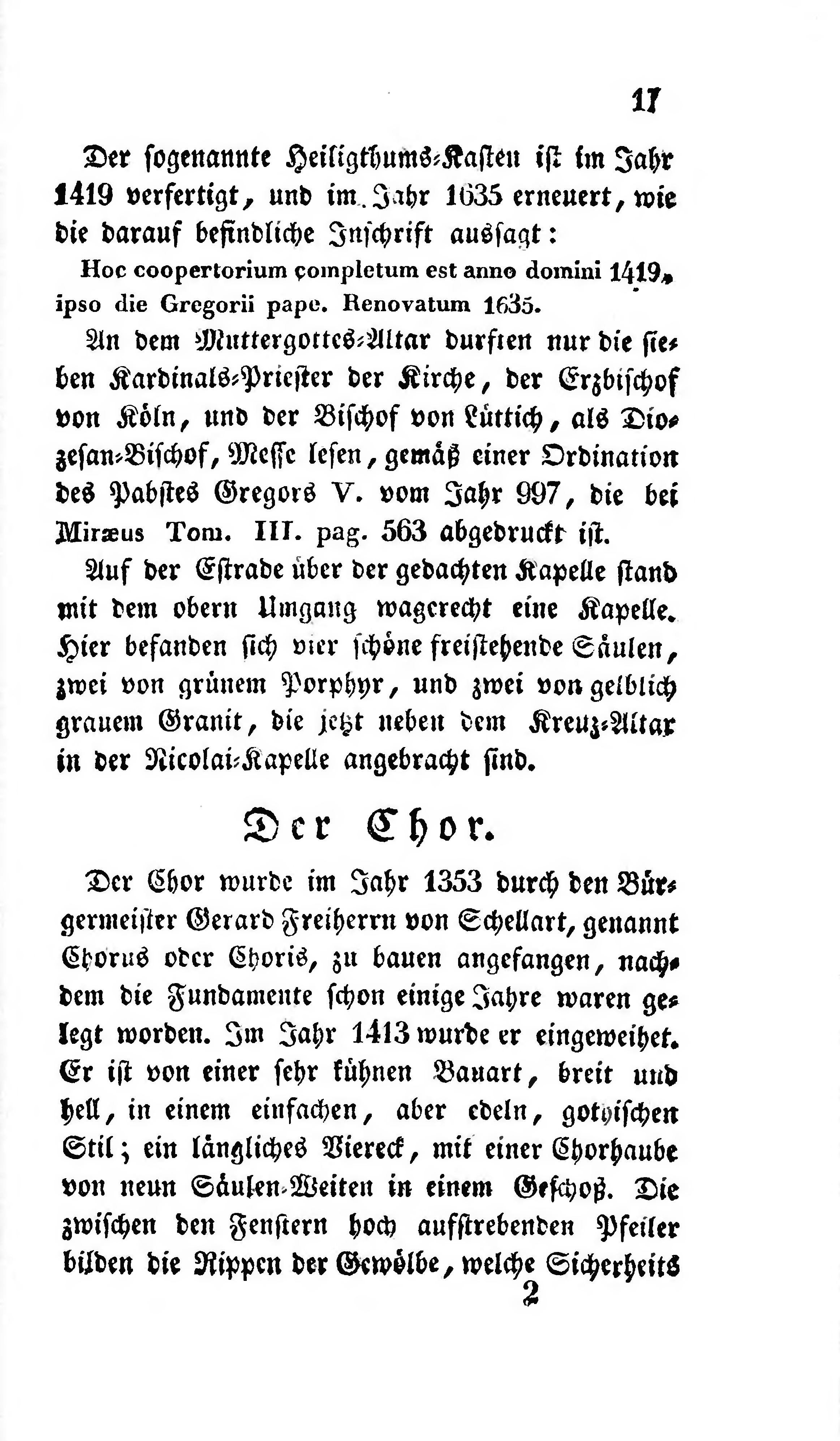 Der Cbor wurde im Jahr 1353 durch den Bürgermeister Gerard Freiherrn von Schellart, genannt Chorus oder Choris, zu bauen angefangen, nachdem die Fundamente schon einige Jahre waren gelegt worden. Im Jahr 14l3 wurde er eingeweihet. Er ist von einer sehr kühnen Bauart, breit und hell, in einem einfachen, aber edeln, gothischen Stil; ein längliches Viereck, mit einer Chorhaube von neun Süulen-Weiten in einem Geschoß. Die zwischen den Fenstern hoch aufstrebenden Pfeiler bilden die Rippen der Gewölbe, welche Sicherheits
