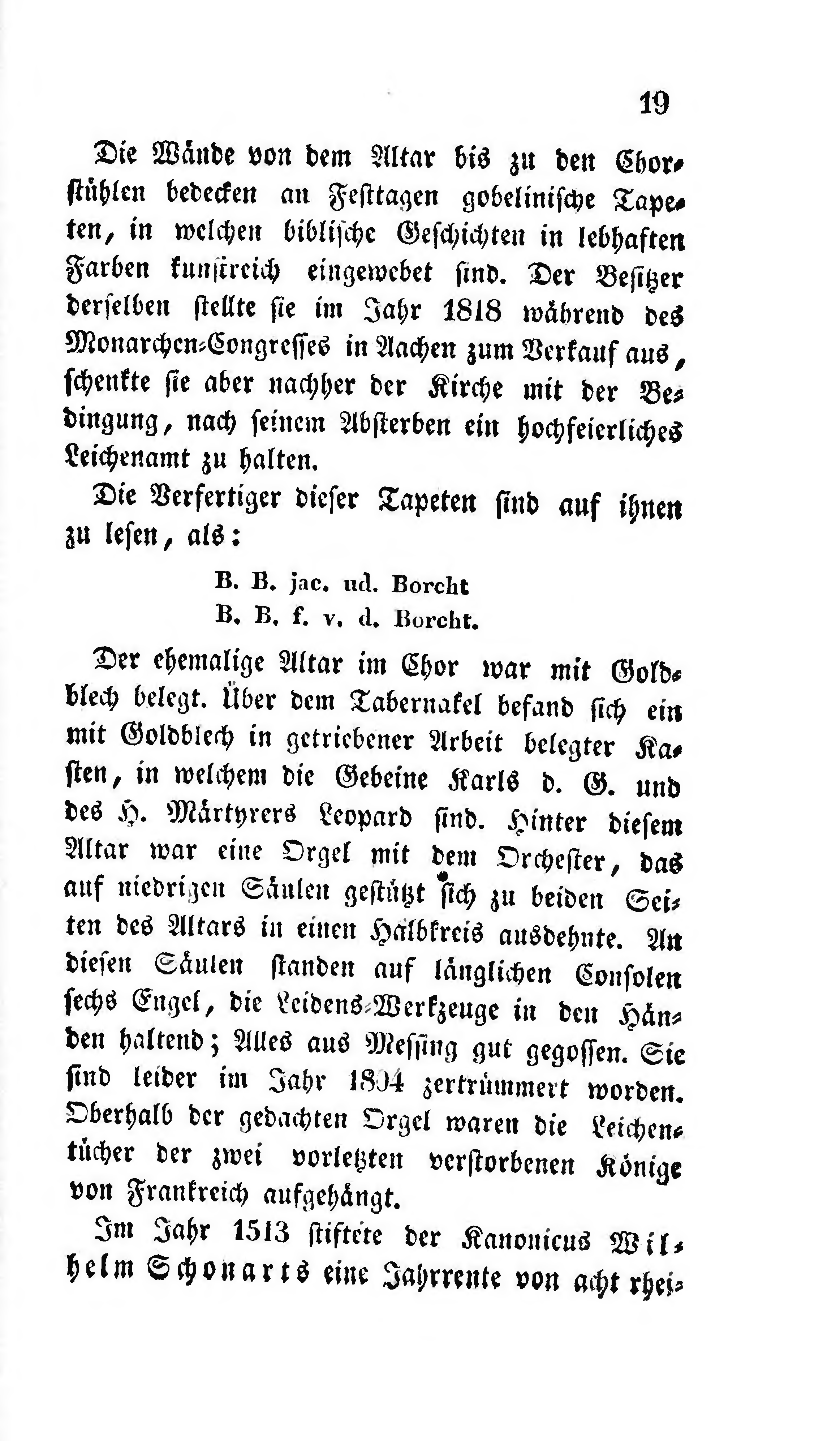 Der ehemalige Altar im Chor war mlt Goldblech belegt. Über dem Tabernakel befand sich ein mit Goldblech in getriebener Arbeit belegter Kasten, in welchem die Gebeine Karls d. G. und des H. Märtyrers Leopard sind. Hinter diesem Altar war eine Orgel mit dem Orchester, das auf niedrigen Säulen gestützt sich zu beiden Seiten des Altars in einen Halbkreis ausdehnte. An diesen Säulen standen auf länglichen Consolen sechs Engel, die Leidens-Werkzeuge in den Händen haltend; Alles aus Messing gut gegossen. Sie sind leider im Jahr 1804 zertrümmert worden. Oberhalb der gedachten Orgel waren die Leichentücher der zwei vorletzten verstorbenen Könige von Frankreich aufgehängt.