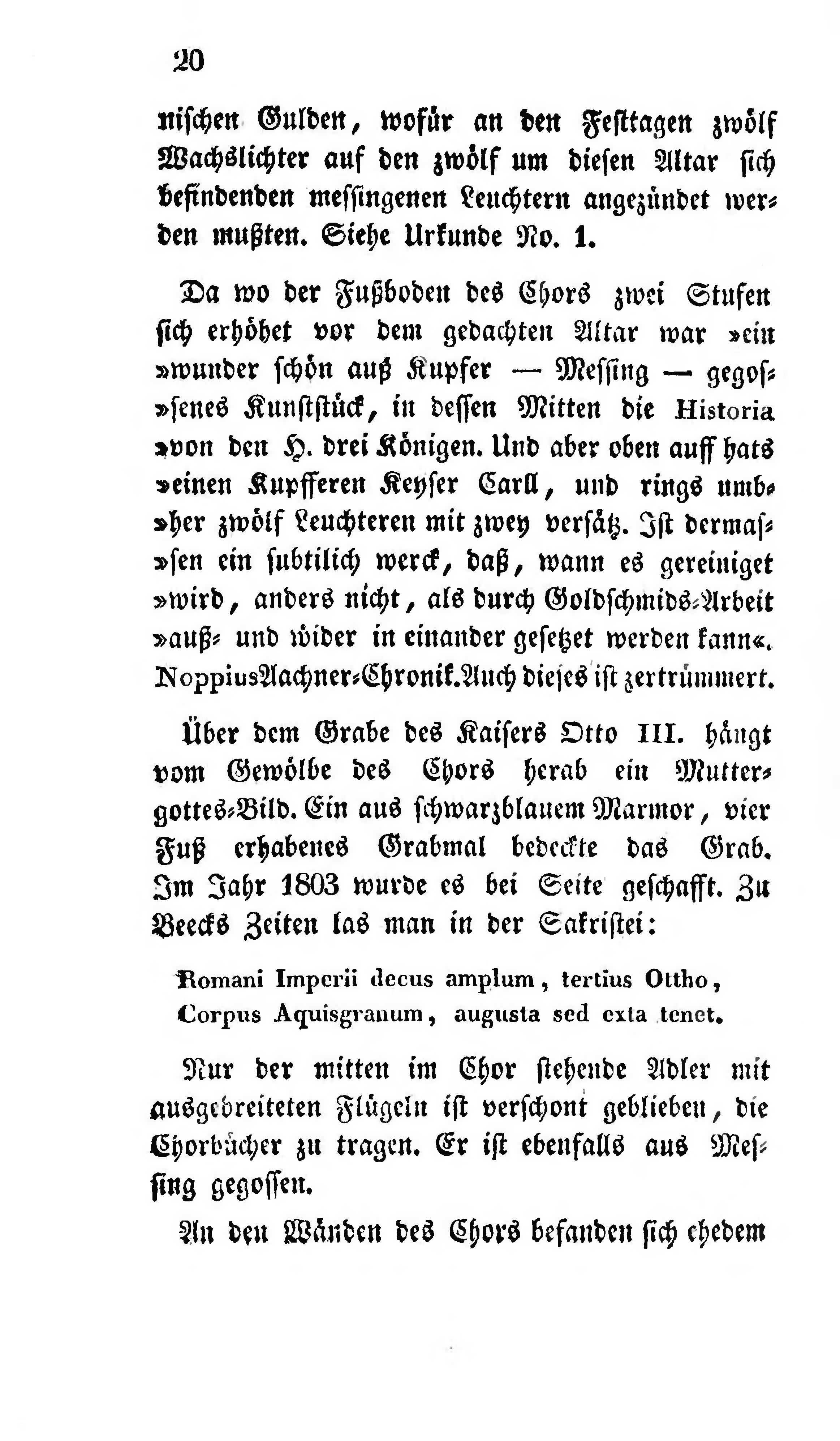 Über dem Grabe des Kaisers Otto III. hängt vom Gewölbe des Chors herab ein Muttergottes-Bild. Ein aus schwarzblauem Marmor, vier Fuß erhabenes Grabmal bedeckte das Grab. Im Jahr 1803 wurde es bei Seite geschafft. Zu Beecks Zeiten las man in der Sakristei: