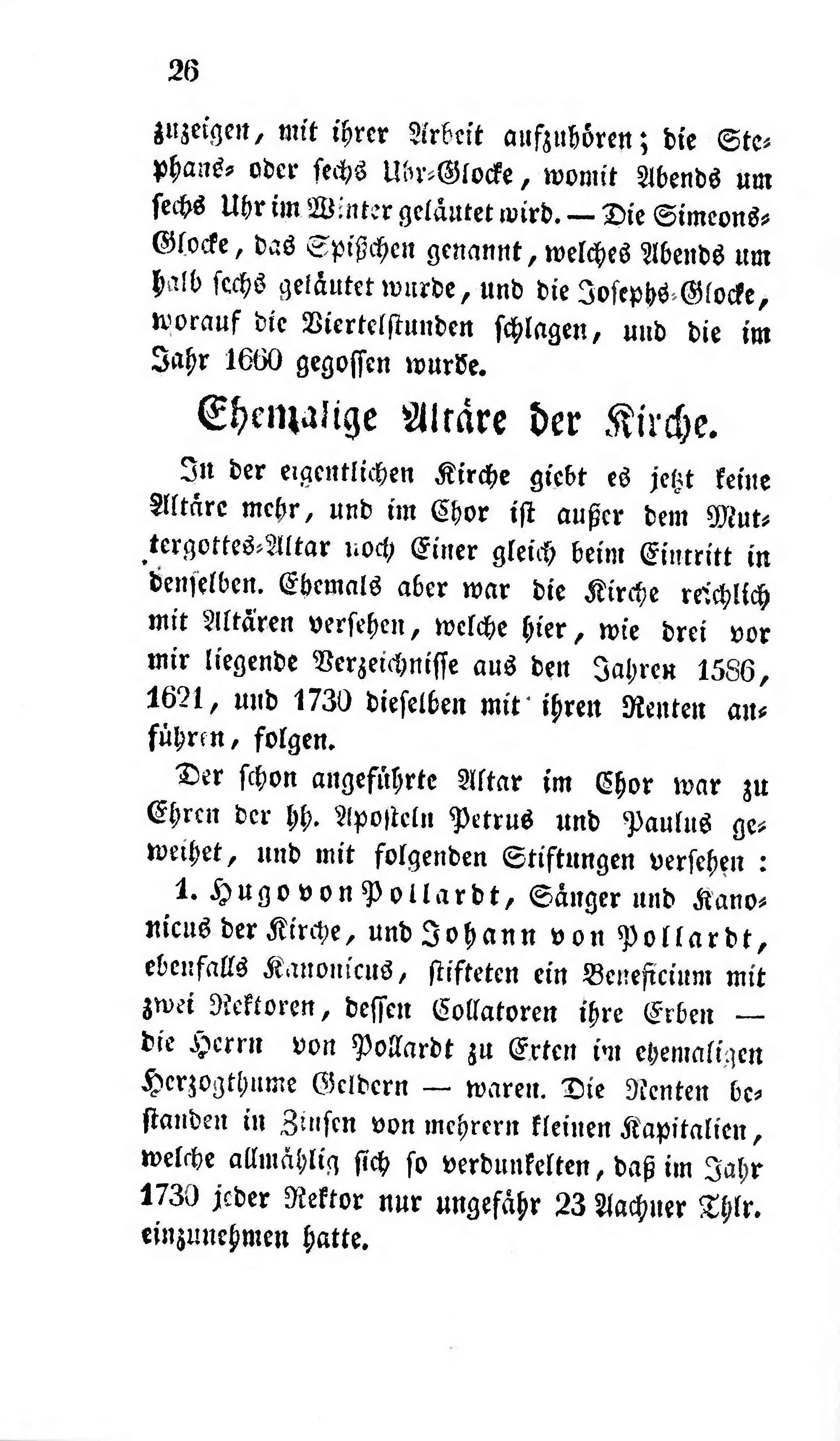 1. Hugo von Pollardt, Sänger und Kanonicus der Kirche, und Johann von Pollardt, ebenfalls Kanonicus, stifteten ein Beneficium mit zwei Rektoren, dessen Collatoren ihre Erben — die Herrn von Pollardt zu Erten im ehemaligen Herzogthume Geldern — waren. Die Renten bestanden in Zinsen von mehrern kleinen Kapitalien, welche allmählich sich so verdunkelten, daß im Jahr 1730 jeder Rektor nur ungefähr 33 Aachner Thlr. einzunehmen hatte.