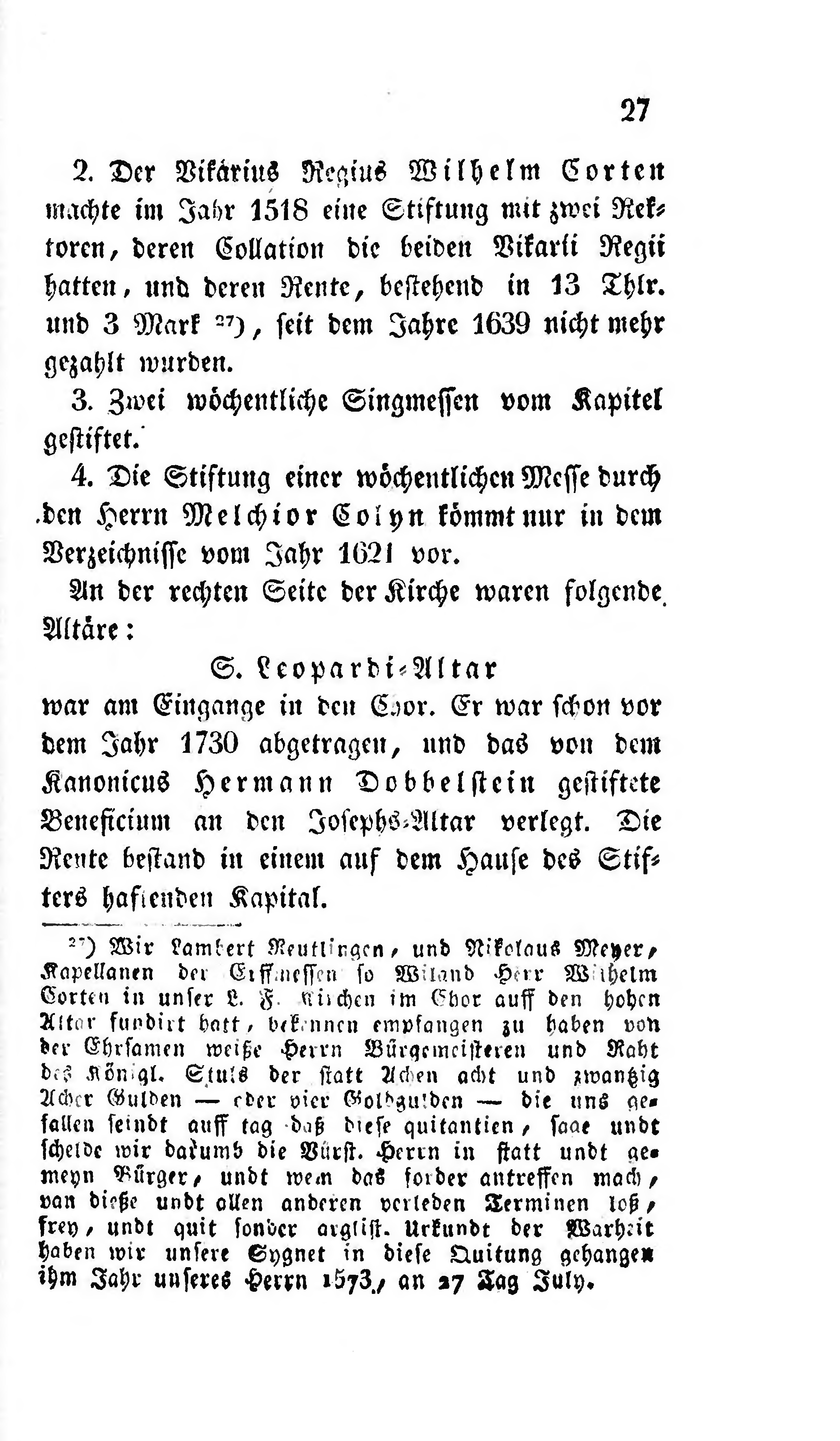 - ↑ Wir Lambert Reutlingen, und Nikolaus Meyer, Kapellanen der Erffenessen so Wiland Herr Wilhelm Corten, in unser L. F Kirchen im Chor auff den hohen Altar fundirt batt, bekennen empfangen zu haben von der Ehrsamen weiße Herrn Bürqemisteren und Raht des Köniql. Stuls der statt Achen acht und zwantzig Acher Gulden — oder vier Goldgulden — die uns gefallen seindt auff tag daß dlese quitantien, sagae undt schelde wir darumb die Vürst. Herrn in statt undt gemeyn Bürger, undt wenn das sonder antreffen mach, van dieße undt allen anderen verleden Terminen loß, frey, undt quit sonder arglist. Urkunde der Warheit haben wir unsere Sygnet in diese Quitung gehangen ihm Jahr unseres Herrn 1573, an ,7 Tag July.