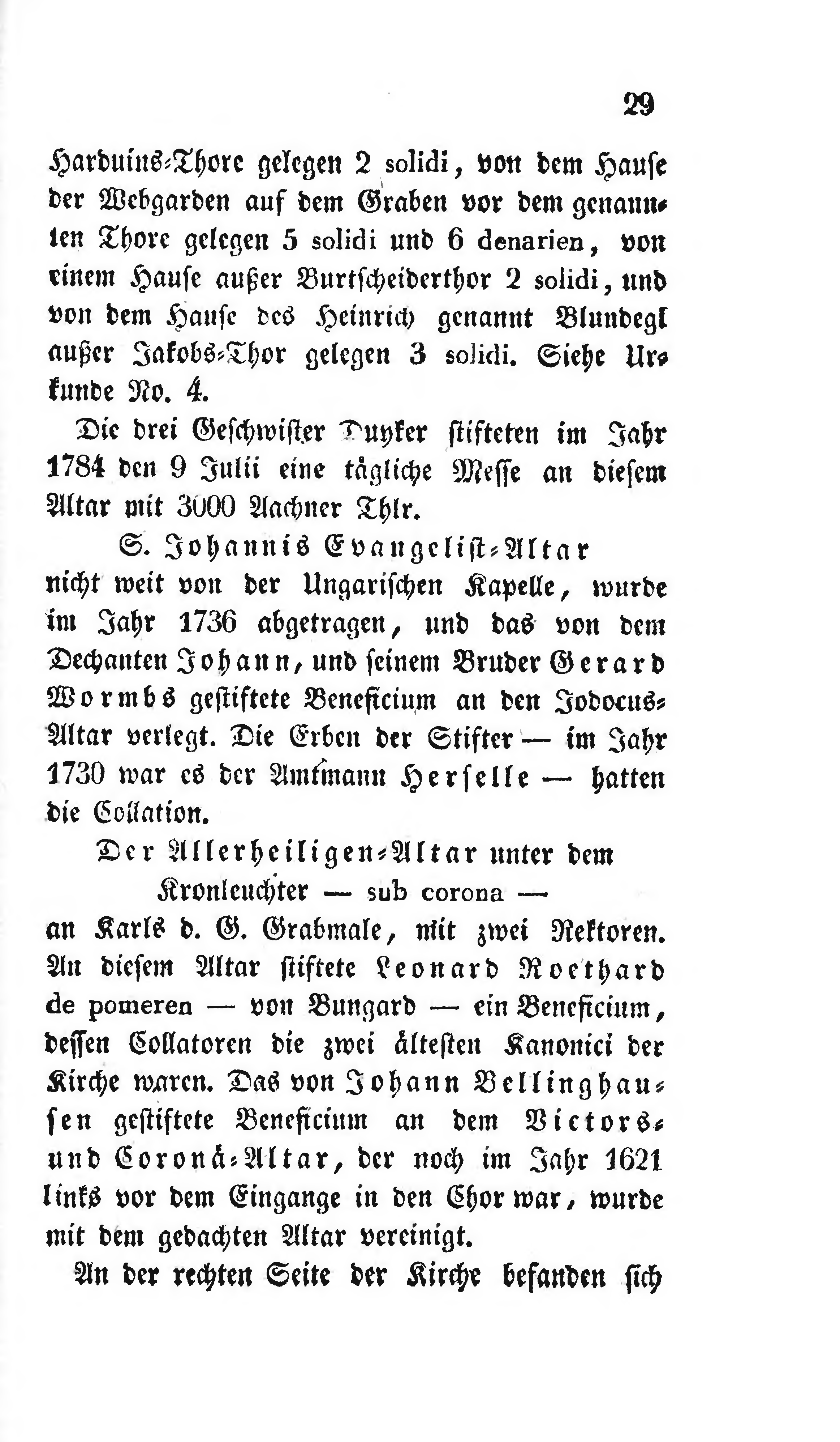 an Karls d. G. Grabmale, mit zwei Rektoren. An diesem Altar stiftete Leonard Roethard de pomeren — von Bungard — ein Beneficium, dessen Collatoren die zwei ältesten Kanonici der Kirche waren. Das von Johann Bellinghausen gestiftete Beneficium an dem Victors- und Coronä-Altar, der noch im Jahr 1621 links vor dem Eingange in den Chor war, wurde mit dem gedachten Altar vereinigt.