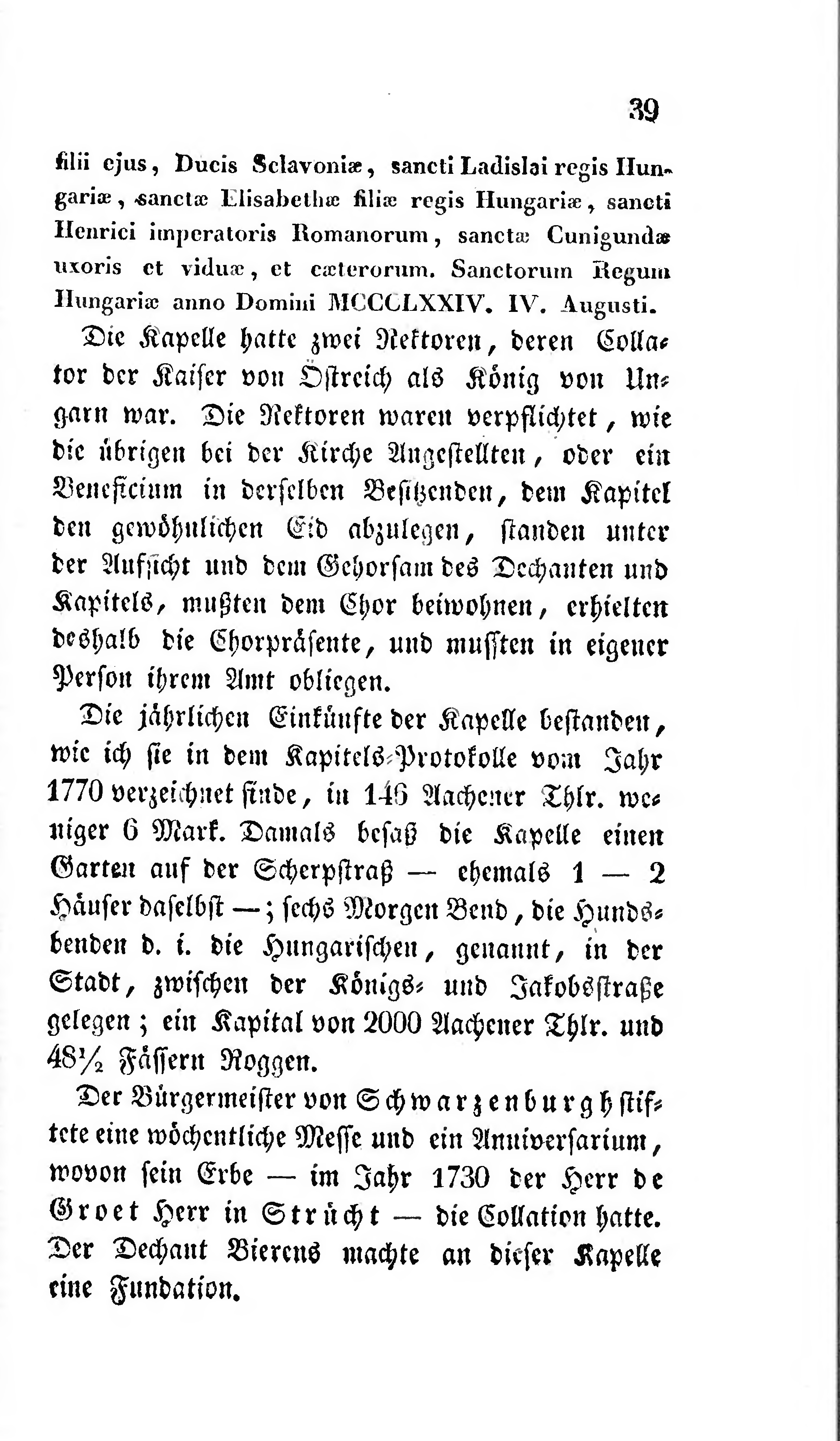 Die jährlichen Einkünfte der Kapelle bestanden, wie ich sie in dem Kapitels-Protokolle vom Jahr 1770 verzeichnet finde, in 146 Aachener Thlr. weniger 6 Mark. Damals besaß die Kapelle einen Garten auf der Scherpstraß — ehemals 1 — 2 Häuser daselbst —; sechs Morgen Bend, die Hundsbenden d. i. die Hungarischen, genannt, in der Stadt, zwischen der Königs- und Jakobsstraße gelegen; ein Kapital von 2000 Aachener Thlr. und 48½ Fässern Roggen.