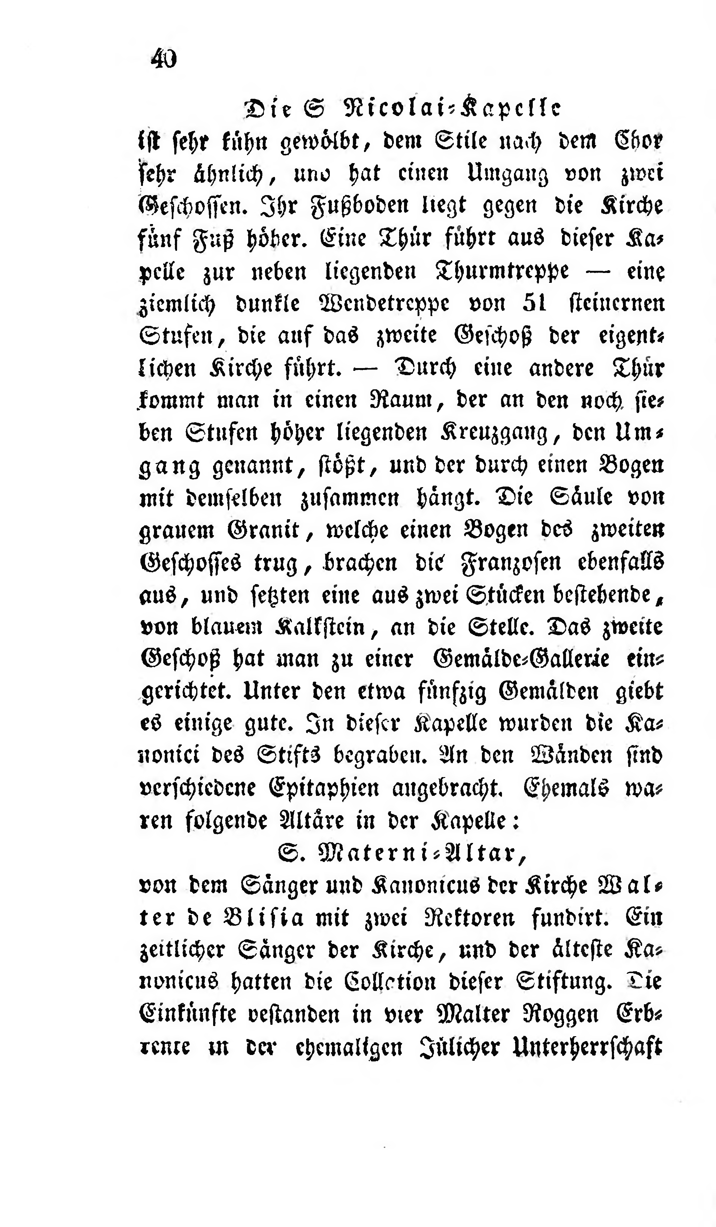ist sehr kühn gewölbt, dem Stile nach dem Chor sehr ähnlich, und hat einen Umgang von zwei Geschossen. Ihr Fußboden liegt gegen die Kirche fünf Fuß höher. Eine Thür führe aus dieser Kapelle zur neben liegenden Thurmtreppe — eine ziemlich dunkle Wendetreppe von 51 steinernen Stufen, die auf das zweite Geschoß der eigentlichen Kirche führt. — Durch eine andere Thür kommt man in einen Raum, der an den noch sieben Stufen höher liegenden Kreuzgang, den Umgang genannt, stößt, und der durch einen Bogen mit demselben zusammen hängt. Die Säule von grauem Granit, welche einen Bogen dcs zweiten Geschosses trug, brachen die Franzosen ebenfalls aus, und setzten eine aus zwei Stücken bestehende, von blauen Kalkstein, an die Stelle. Das zweite Geschoß hat man zu einer Gemälde-Gallerie eingerichtet. Unter den etwa fünfzig Gemälden giebt es einige gute. In dieser Kapelle wurden die Kanonici des Stifts begraben. An den Wänden sind verschiedene Epitaphien angebracht. Ehemals waren folgende Altäre in der Kapelle: