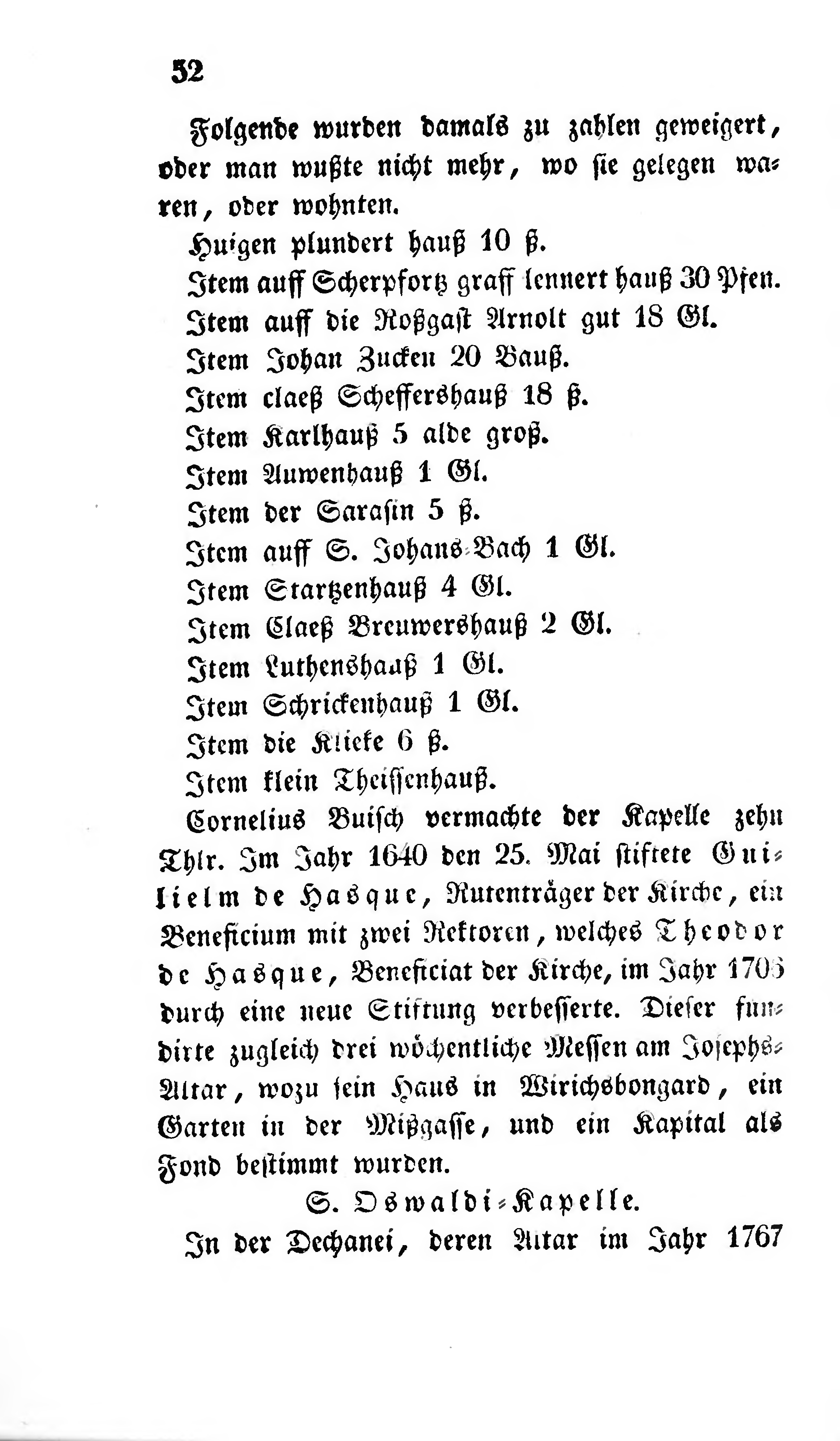 Cornelius Buisch vermachte der Kapelle zehn Thlr. Im Jahr 1640 den 25. Mai stiftete Guilielm de Hasque, Rutenträger der Kirche, ein Beneficium mit zwei Rektoren, welches Theodor de Hasque, Beneficiat der Kirche, im Jahr 1703 durch eine neue Stiftung verbesserte. Dieser fundirte zugleich drei wöchentliche Messen am Josephs-Altar, wozu sein Haus in Wirichsbongard, ein Garten in der Mißgasse, und ein Kapital als Fond bestimmt wurden.