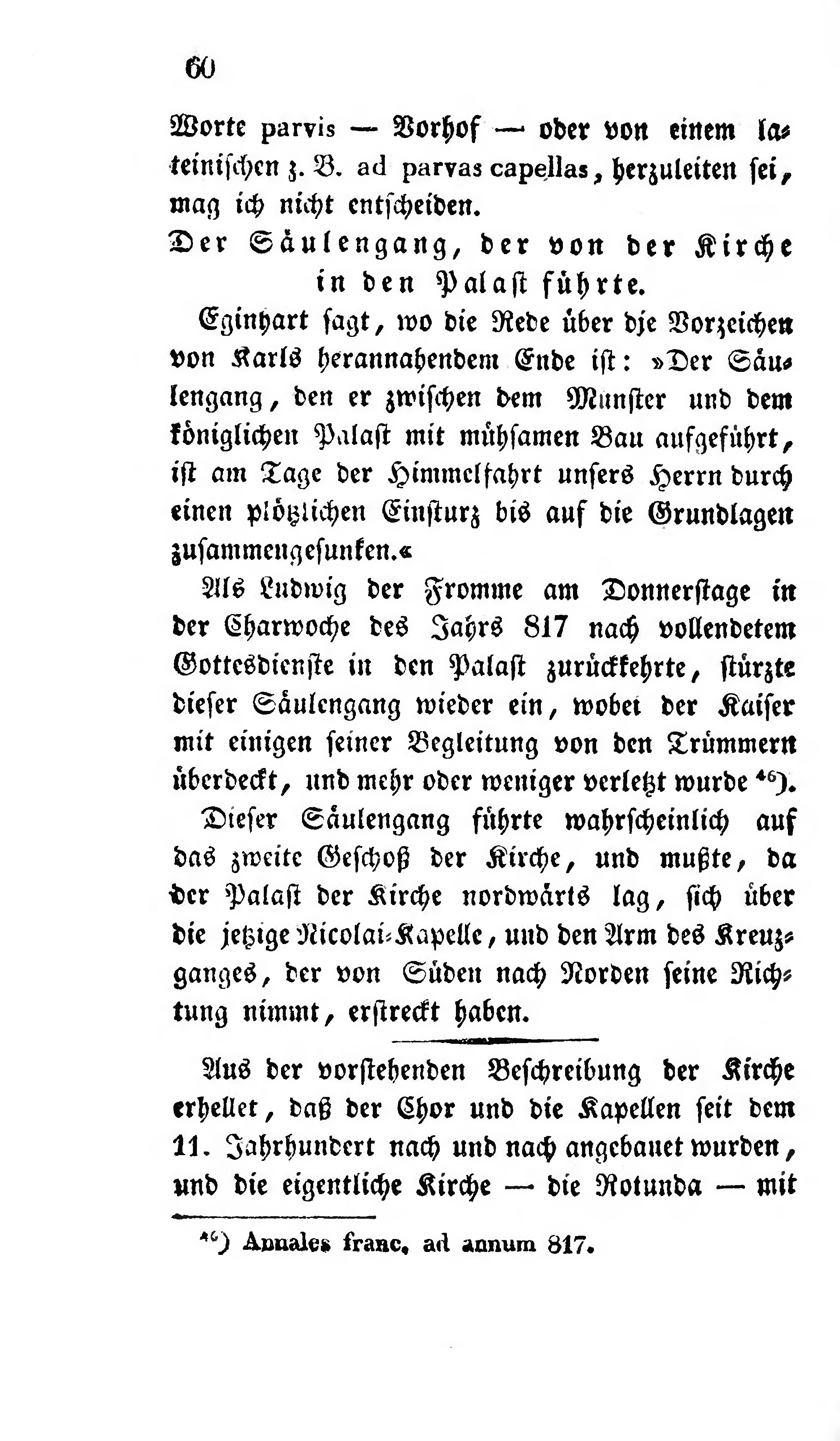 Eginhart sagt, wo die Rede über die Vorzeichen von Karls herannahendem Ende ist: »Der Säulengang, den er zwischen dem Münster und dem königlichen Palast mit mühsamen Bau aufgeführt, ist am Tage der Himmelfahrt unsers Herrn durch einen plötzlichen Einsturz bis auf die Grundlagen zusammengesunken.«
