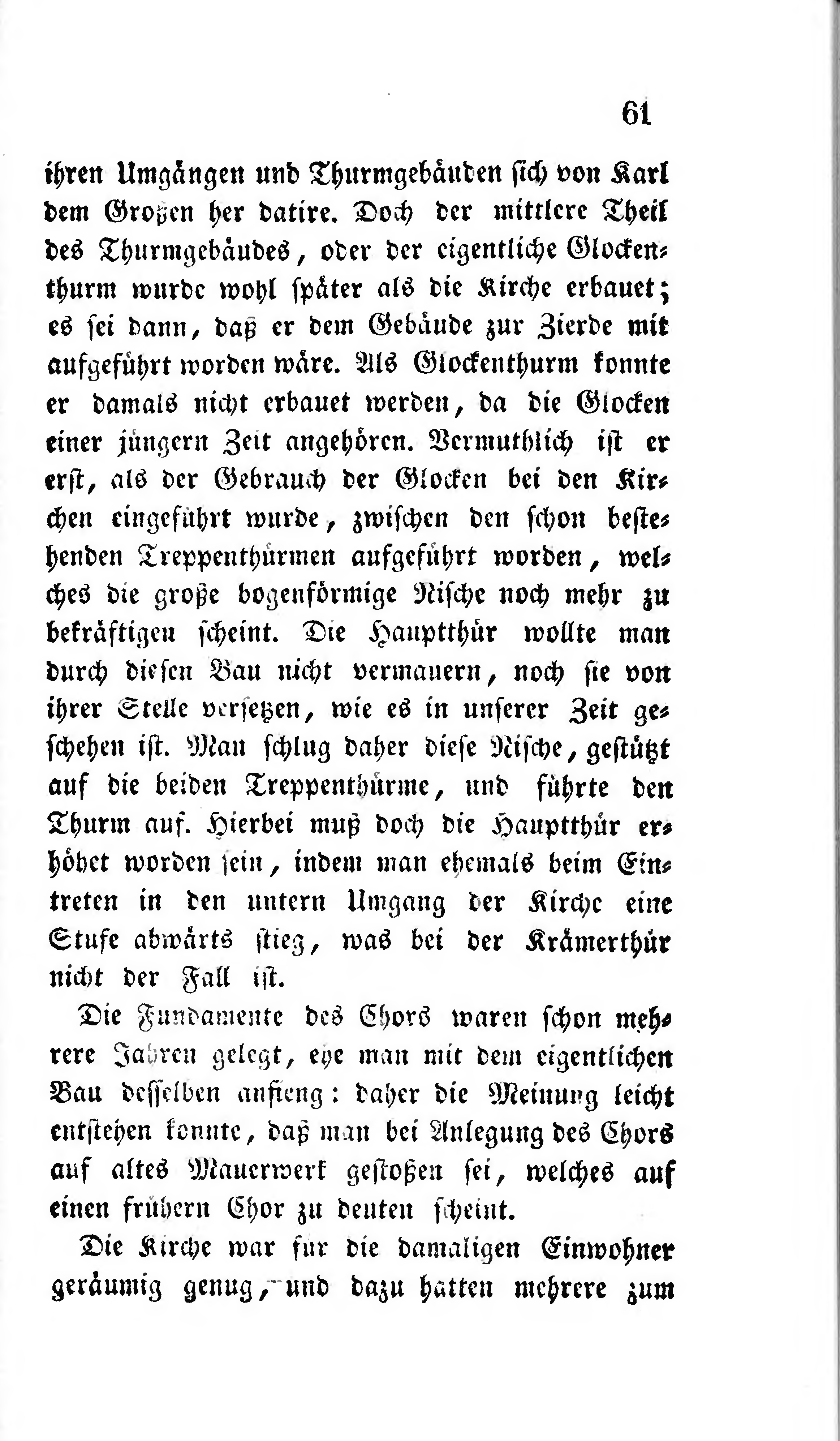 ihren Umgängen und Thurmgebäuden sich von Karl dem Großen her datire. Doch der mittlere Theil des Thurmgebäudes, oder der eigentliche Glockenthurm wurde wohl später als die Kirche erbauet; es sei dann, daß er dem Gebäude zur Zierde mit aufgeführt worden wäre. Als Glockenthurm konnte er damals nicht erbauet werden, da die Glocken einer jüngern Zeit angehören. Vermuthlich ist er erst, als der Gebrauch der Glocken bei den Kirchen eingeführt wurde, zwischen den schon bestehenden Treppenthürmen aufgeführt worden, welches die große bogenförmige Nische noch mehr zu bekräftigen scheint. Die Hauptthür wollte man durch diesen Bau nicht vermauern, noch sie von ihrer Stelle versetzen, wie es in unserer Zeit geschehen ist. Man schlug daher diese Nische, gestützt auf die beiden Treppenthürme, und führte den Thurm auf. Hierbei muß doch die Hauptthür erhöhet worden sein, indem man ehemals beim Eintreten in den untern Umgang der Kirche eine Stufe abwärts stieg, was bei der Kramerthür nicht der Fall ist.