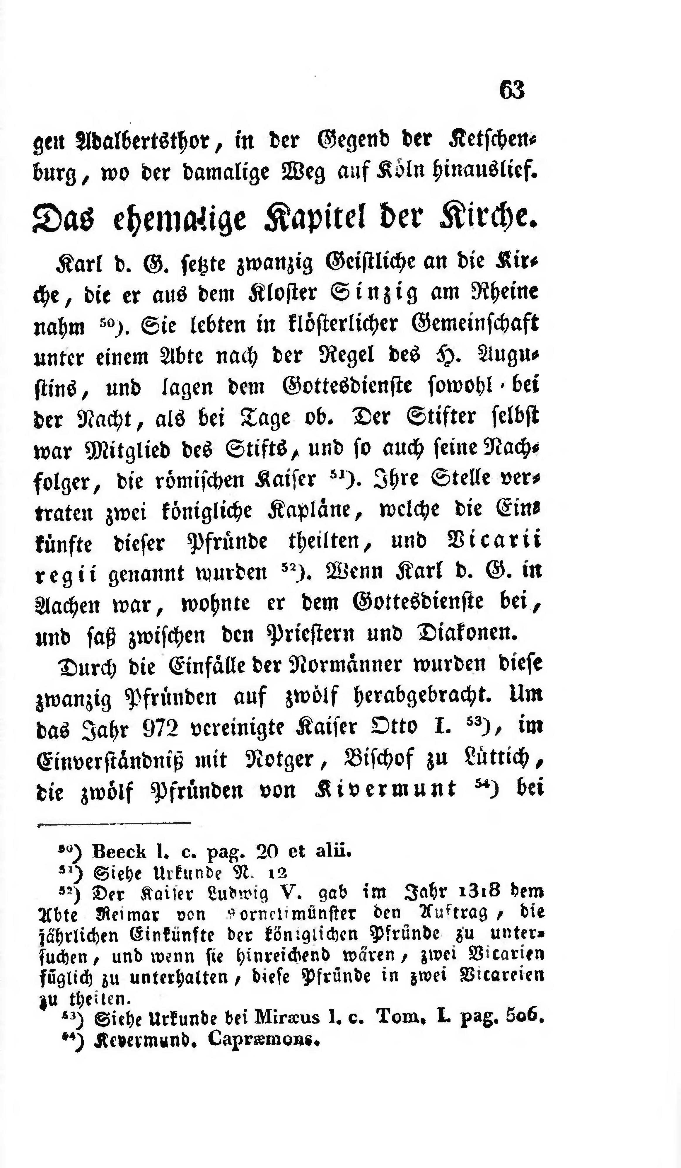 Karl d. G. setzte zwanzig Geistliche an die Kir­che, die er aus dem Kloster Sinzig am Rheine nahm [1]. Sie lebten in klösterlicher Gemeinschaft unter einem Abte nach der Regel des H. Augustins, und lagen dem Gottesdienste sowohl bei der Nacht, als bei Tage ob. Der Stifter selbst war Mitglied des Stifts, und so auch seine Nach­folger, die römischen Kaiser[2]. Ihre Stelle ver­traten zwei königliche Kapläne, welche die Einkünfte dieser Pfründe theilten, und Vicarii regii genannt wurden[3]. Wenn Karl d. G. in Aachen war, wohnte er dem Gottesdienste bei, und saß zwischen den Priestern und Diakonen.