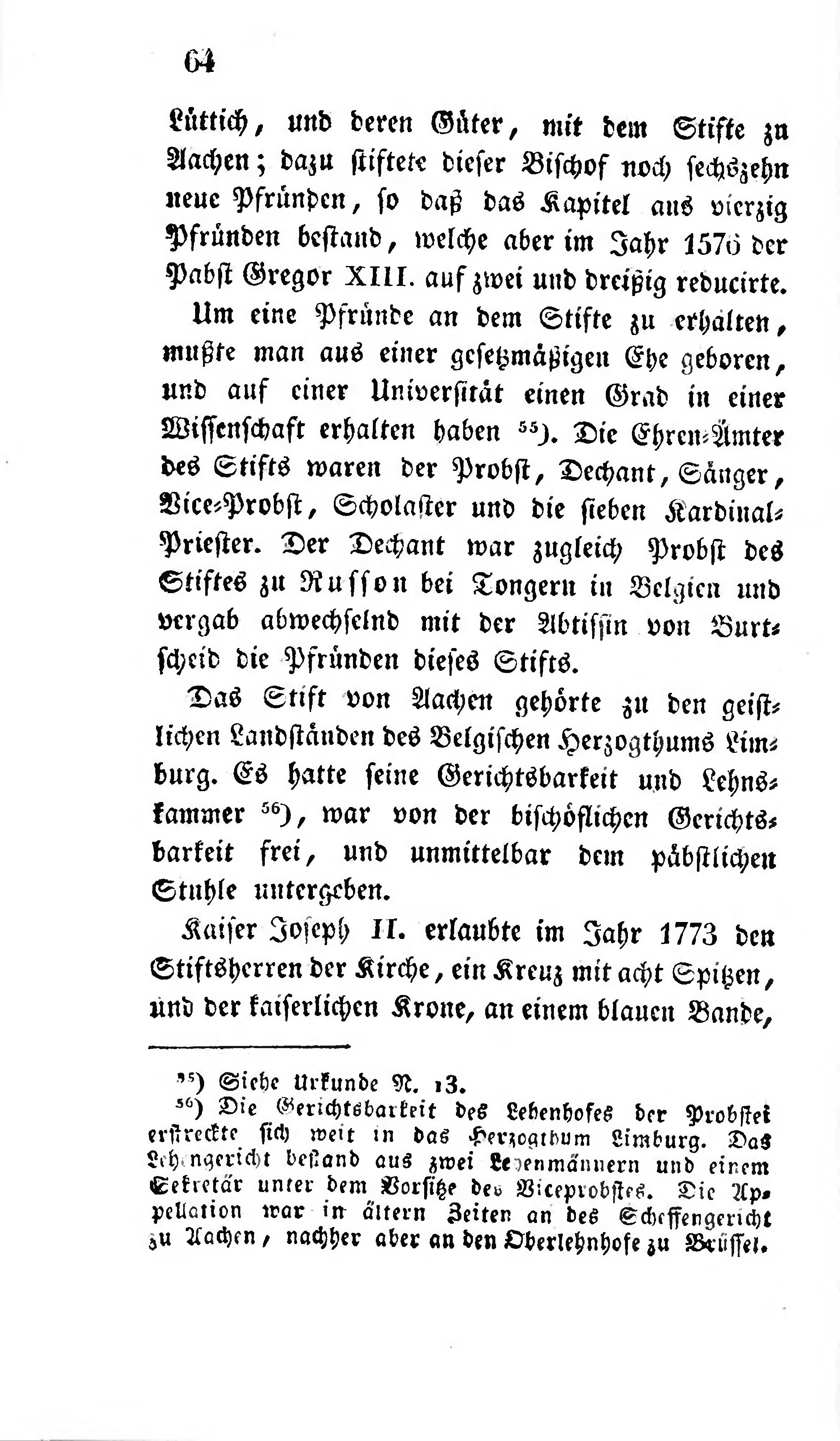 Das Stift von Aachen gehörte zu den geist­lichen Landständen des Belgischen Herzogthums Limburg. Es hatte seine Gerichtsbarkeit und Lehnskammer[2], war von der bischöflichen Gerichts­barkeit frei, und unmittelbar dem päbstlichen Stuhle untergeben.
