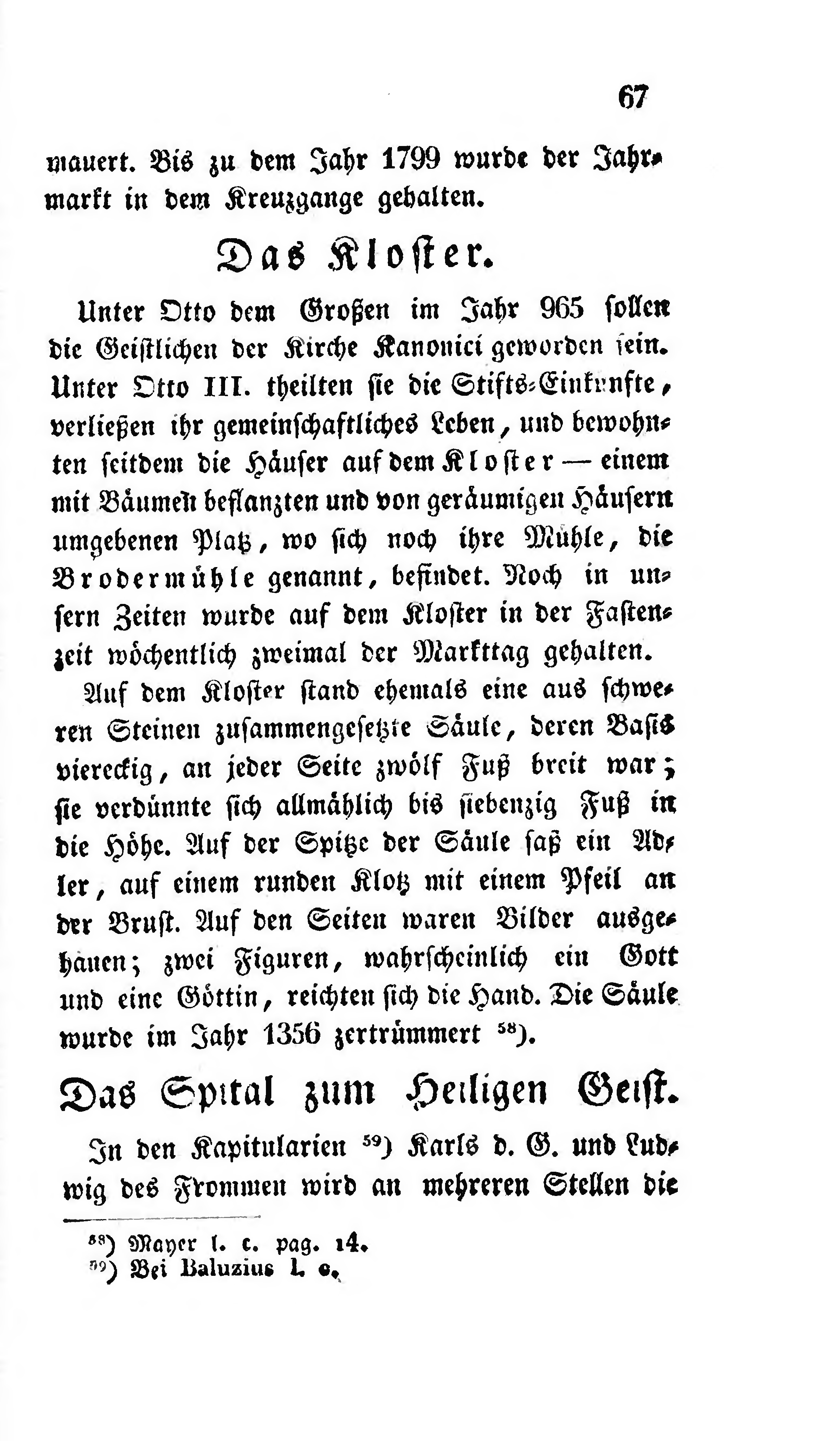 Unter Otto dem Großen im Jahr 965 sollen die Geistlichen der Kirche Kanonici geworden sein. Unter Otto III. theilten sie die Stifts-Einkünfte, verließen ihr gemeinschaftliches Leben, und bewohn­ten seitdem die Häuser auf dem Kloster — einem mit Bäumen befpanzten und von geräumigen Häusern umgebenen Platz, wo sich noch ihre Mühle, die Brodermühle genannt, befindet. Noch in un­sern Zeiten wurde auf dem Kloster in der Fastenzeit wöchentlich zweimal der Markttag gehalten.
