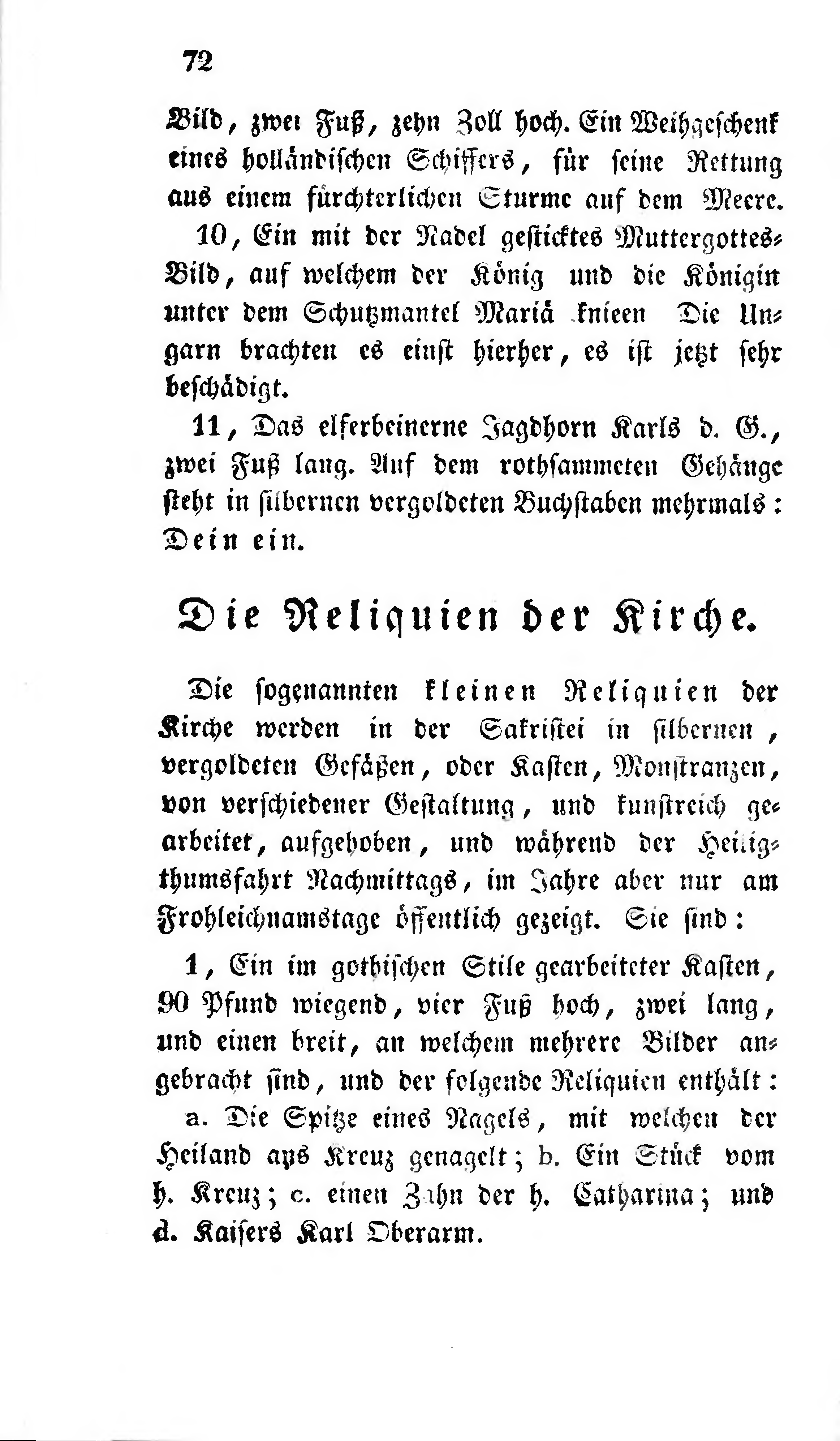 Die sogenannten kleinen Reliquien der Kirche werden in der Sakristei in silbernen, vergoldeten Gefäßen, oder Kasten, Monstranzen, von verschiedener Gestaltung, und kunstreich ge­arbeitet, aufgehoben, und wahrend der Heiiigthumsfahrt Nachmittags, im Jahre aber nur am Frohleichnamstage öffentlich gezeigt. Sie sind: