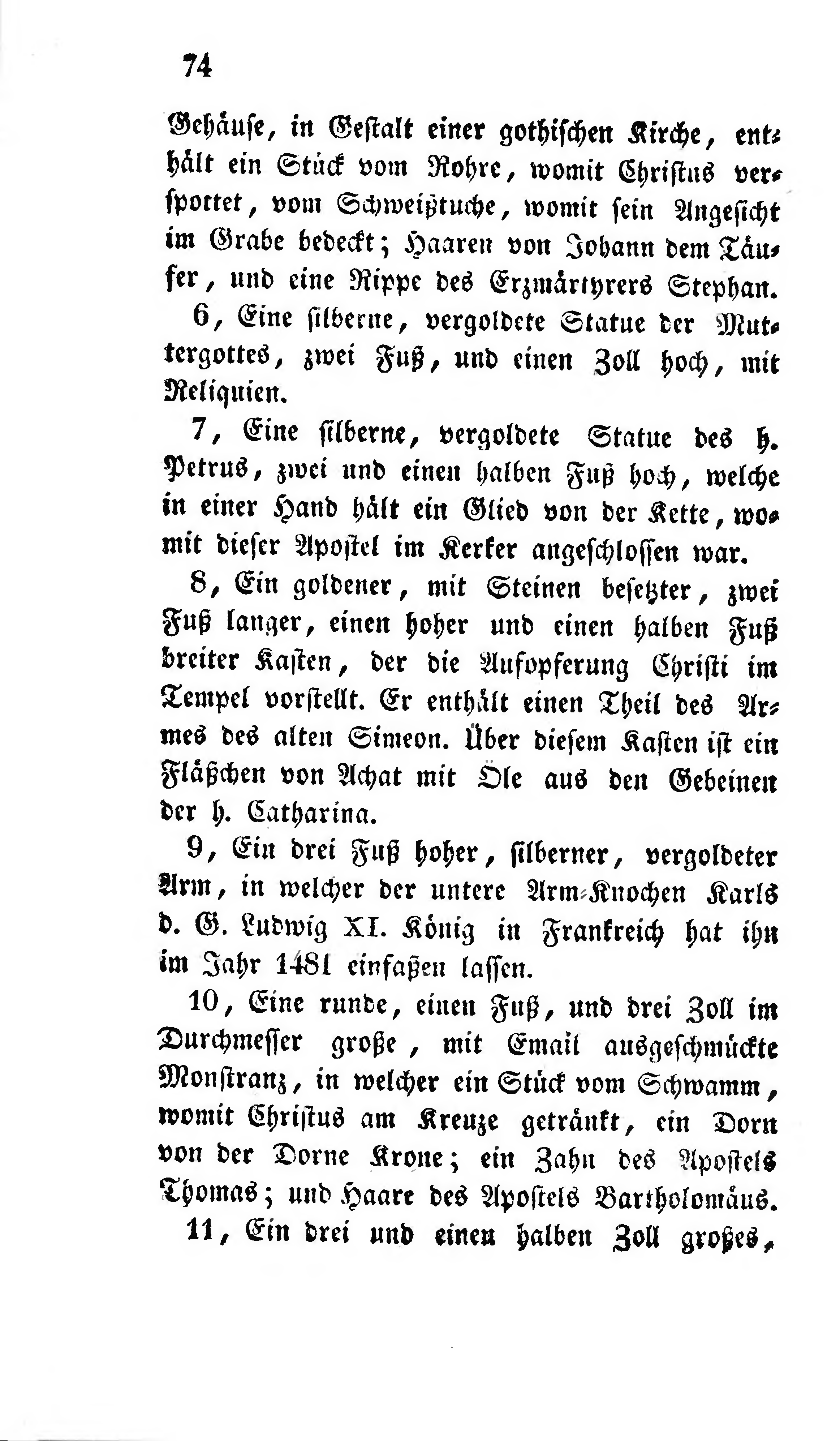 10, Eine runde, einen Fuß, und drei Zoll im Durchmesser große, mit Email ausgeschmückte Monstranz, in welcher ein Stück vom Schwamm, womit Christus am Kreuze getränkt, ein Dorn von der Dorne Krone; ein Zahn des Apostels Thomas; und Haare des Apostels Bartholomäus.