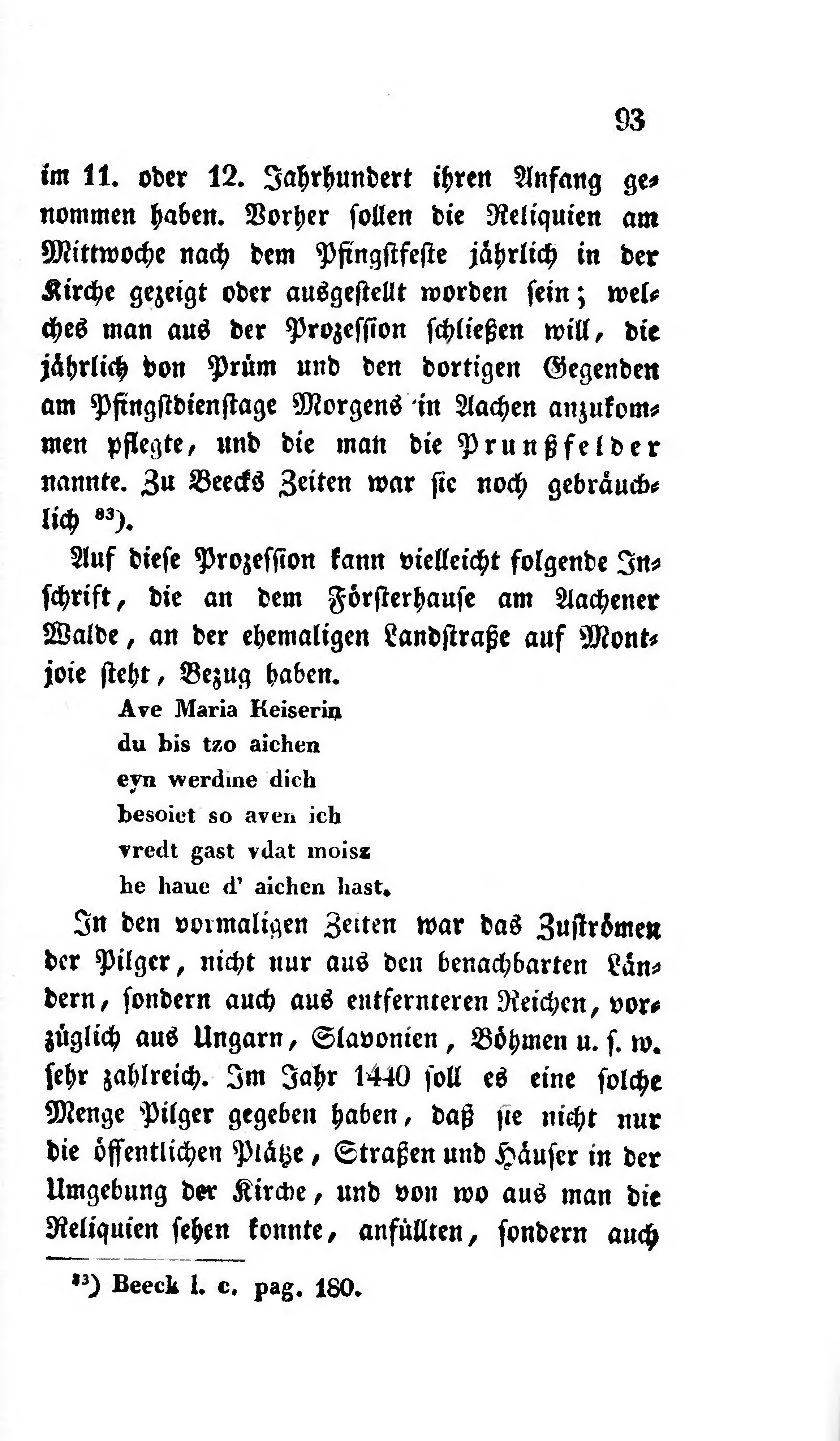 im 11. oder 12. Jahrhundert ihren Anfang genommen haben. Vorher sollen die Reliquien am Mittwoche nach dem Pfingstfeste jährlich in der Kirche gezeigt oder ausgestellt worden sein; welches man aus der Prozession schließen will, die jährlich von Prüm und den dortigen Gegenden am Pfingstdienstage Morgens in Aachen anzukommen pflegte, und die man die Prunßfelder nannte. Zu Beecks Zeiten war sie noch gebräuchlich [1].