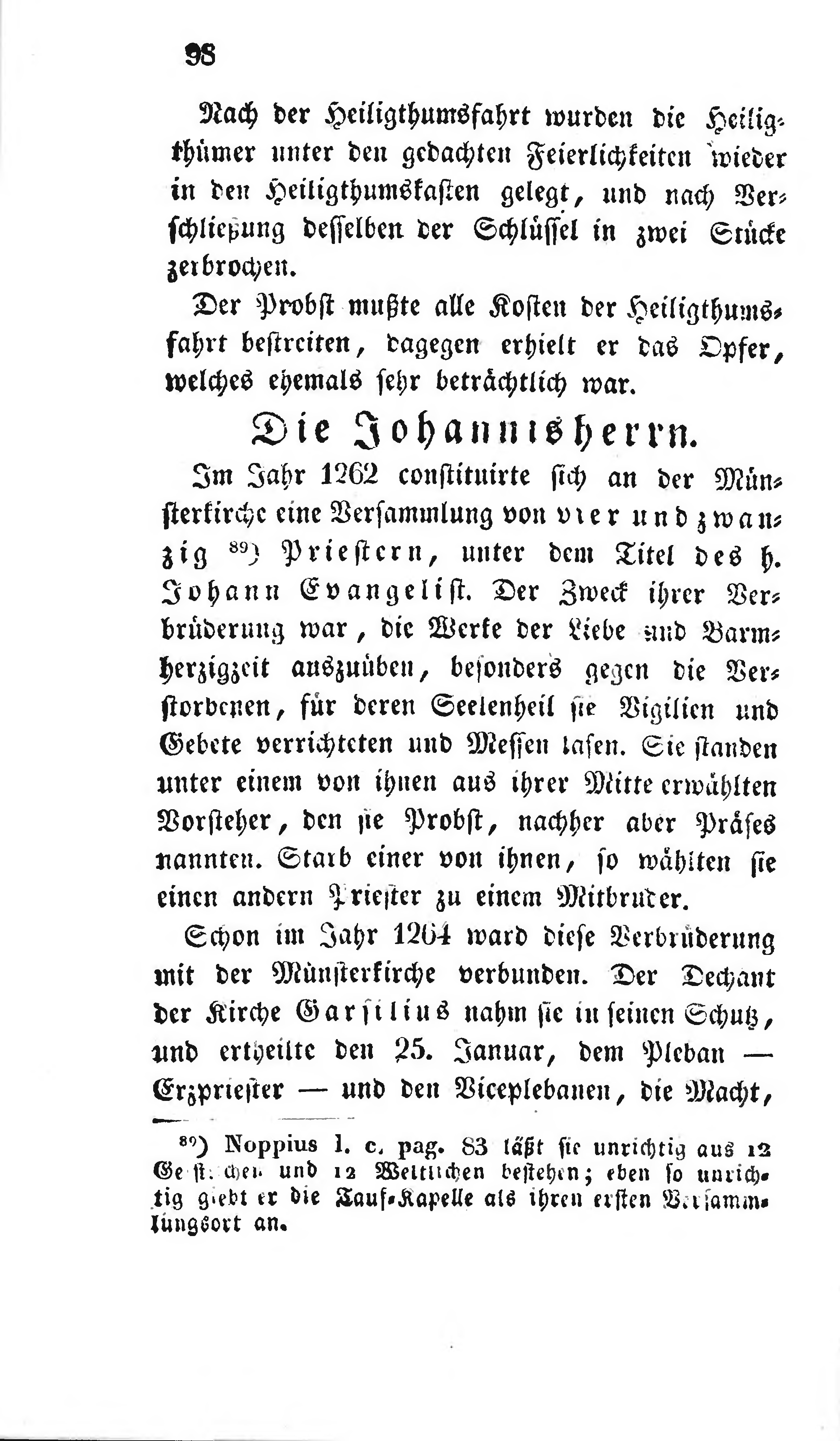 Im Jahr 1262 constituirte sich an der Münsterkirche eine Versammlung von vier und zwanzig[1] Priestern, unter dem Titel des h. Johann Evangelist. Der Zweck ihrer Verbrüderung war, die Werke der Liebe und Barmherzigkeit auszuüben, besonders gegen die Verstorbenen, für deren Seelenheil sie Vigilien und Gebete verrichteten und Messen lasen. Sie standen unter einem von ihnen aus ihrer Mitte erwählten Vorsteher, den sie Probst, nachher aber Präses nannten. Starb einer von ihnen, so wählten sie einen andern Priester zu einem Mitbruder.