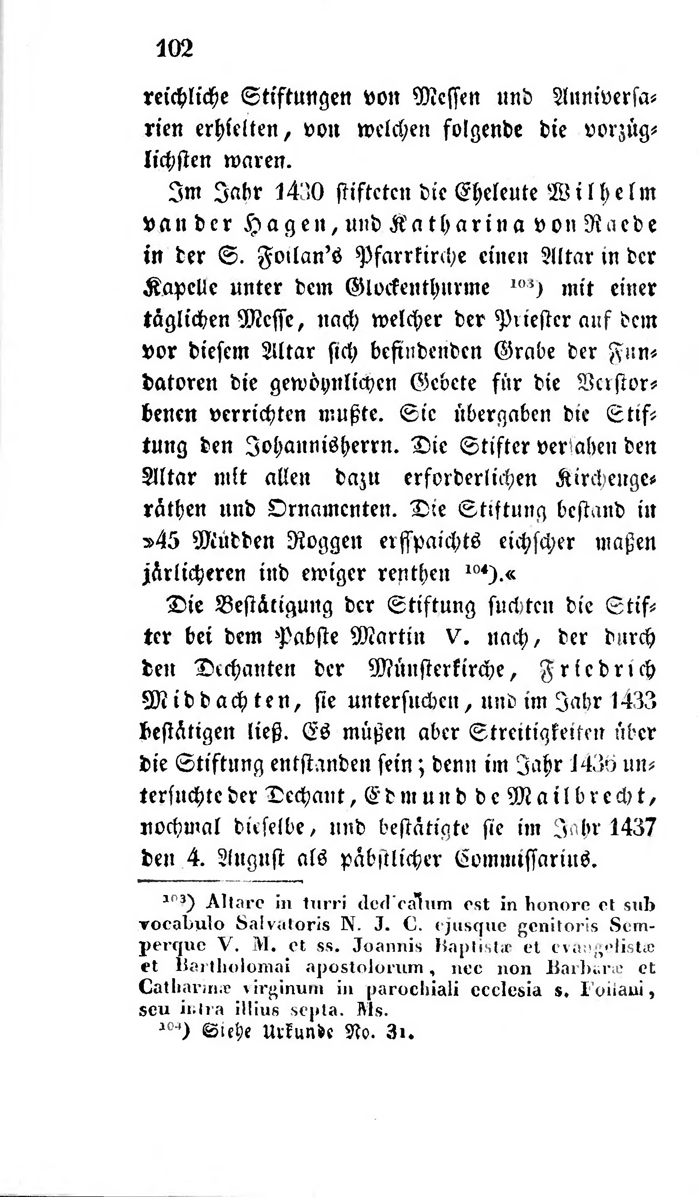 Im Jahr 1430 stifteten die Eheleute Wilhelm van der Hagen, und Katharina von Raede in der S. Foilan's Pfarrkirche einen Altar in der Kapelle unter dem Glockenthurme[1] mit einer täglichen Messe, nach welcher der Priester auf dem vor diesem Altar sich befindenden Grabe der Fundatoren die gewöhnlichen Gebete für die Verstorbenen verrichten mußte. Sie übergaben die Stiftung den Johannisherrn. Die Stifter versahen den Altar mit allen dazu erforderlichen Kirchengeräthen und Ornamenten. Die Stiftung bestand in »45 Mudden Roggen ersspaichts eichscher maßen järlicheren ind ewiger renthen[2]
