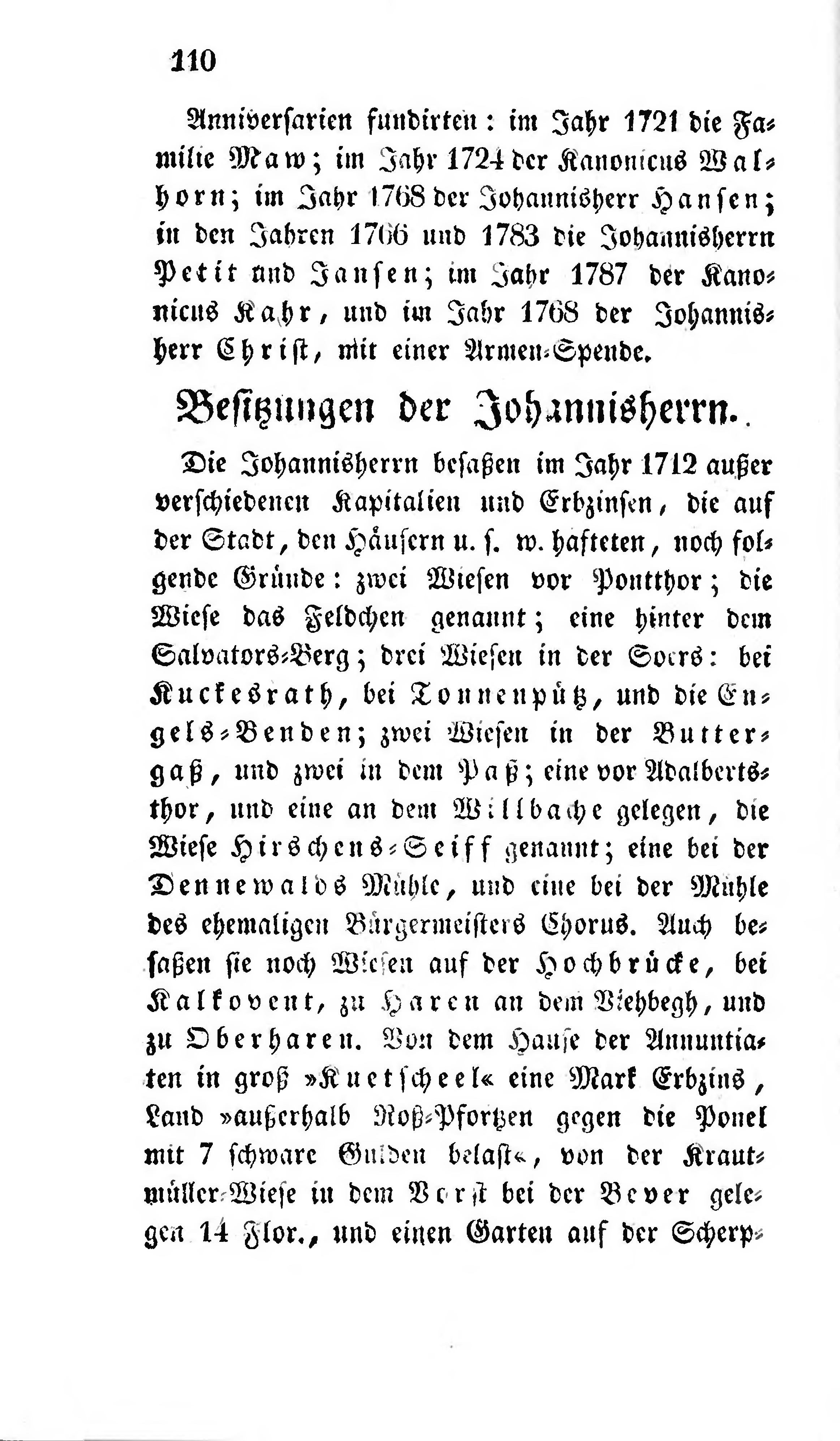 Die Johannisherrn besaßen im Jahr 1712 außer verschiedenen Kapitalien und Erbzinsen, die auf der Stadt, den Häusern u. s. w. hafteten, noch folgende Gründe: zwei Wiesen vor Pontthor; die Wiese das Feldchen genannt; eine hinter dcm Salvators-Berg; drei Wiesen in der Soers: bei Kuckesrath, bei Tonnenpütz, und die Engels-Benden; zwei Wiesen in der Buttergaß, und zwei in dem Paß; eine vor Adalbertsthor, und eine an dem Willbache gelegen, die Wiese Hirschens-Seiff genannt; eine bei der Dennewalds Mühle, und eine bei der Mühle des ehemaligen Bürgermeisters Chorus. Auch besaßen sie noch Wiesen auf der Hochbrücke, bei Kalkovent, zu Haren an dem Viehbegh, und zu Oberharen. Von dem Hause der Annuntiaten in groß »Kuetscheel« eine Mark Erbzins, Land »außerhalb Roß-Pfortzen gegen die Ponel mit 7 schwäre Gulden belast«, von der Krautmüller'Wiese iu dem Vorst bei der Bever gelegen 14 Flor., und einen Garten auf der Scherpstraß.
