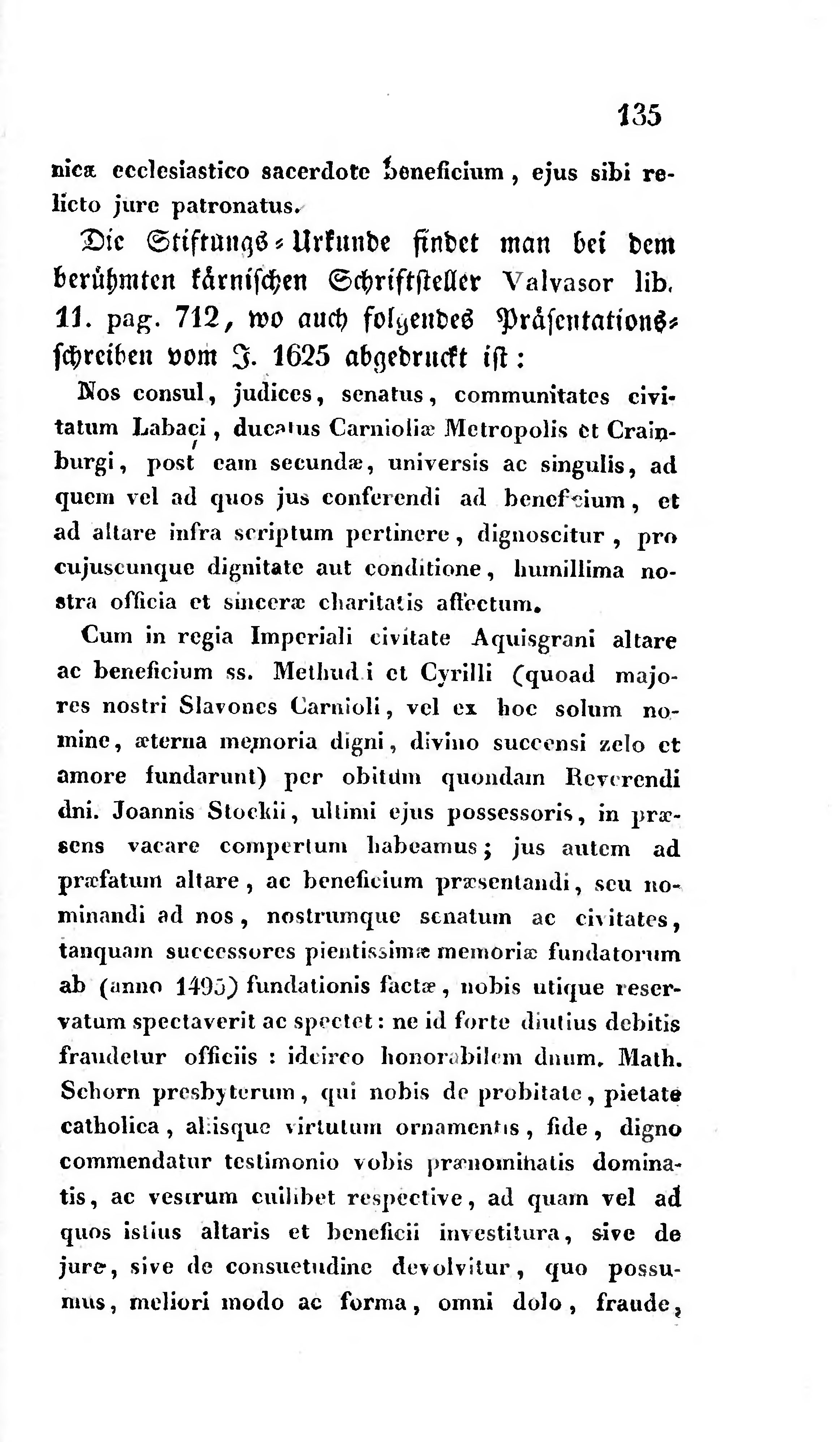 Cum in regia Imperiali civitate Aquisgrani altare ac beneficium ss, Methudii et Cyrilli (quoad majores nostri Slavones Carnioli, vel ex hoc solum nomine, aeterna memoria digni, divino succensi zelo et amore fundarunt) per obitum quondam Reverendi dni. Joannis Stockii, ultimi ejus possessoris, in praesens vacare compertum habeamus; jus autem ad praefatum altare, ac beneficium praesentandi, seu nominandi ad nos, nostrumque senatum ac civitates, tanquam successores pientissimae memoriae fundatorum ab (anno 1495} fundationis factae, nobis utique reservatum spectaverit ac spectet: ne id forte diutius debitis fraudetur officiis: ideireo honorabilem dnum. Math. Schorn presbyterum, qui nobis de probitate, pietate catholica, aliisque vjrtulum ornamentis, fide, digno commendatur testimonio vobis praenominatis dominatis, ac vestrum cuilibet respective, ad quam vel ad quos istius altaris et beneficii investitura, sive de jure, sive de consuetudine devolvitur, quo possumus, meliori modo ac forma, omni dolo, fraude,